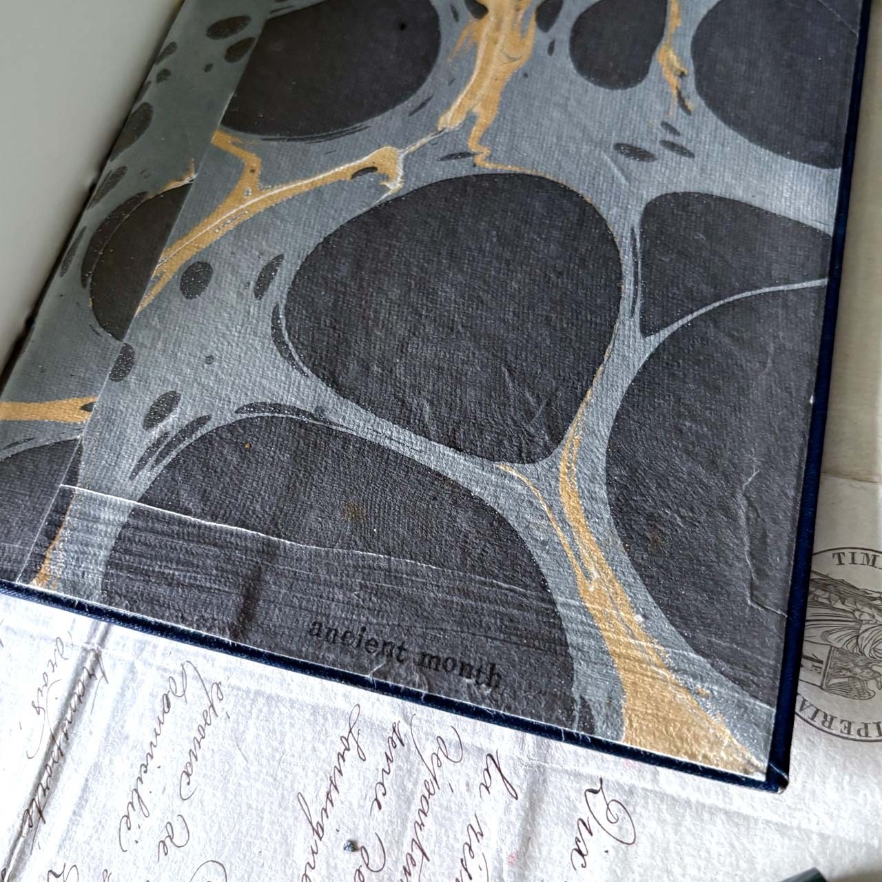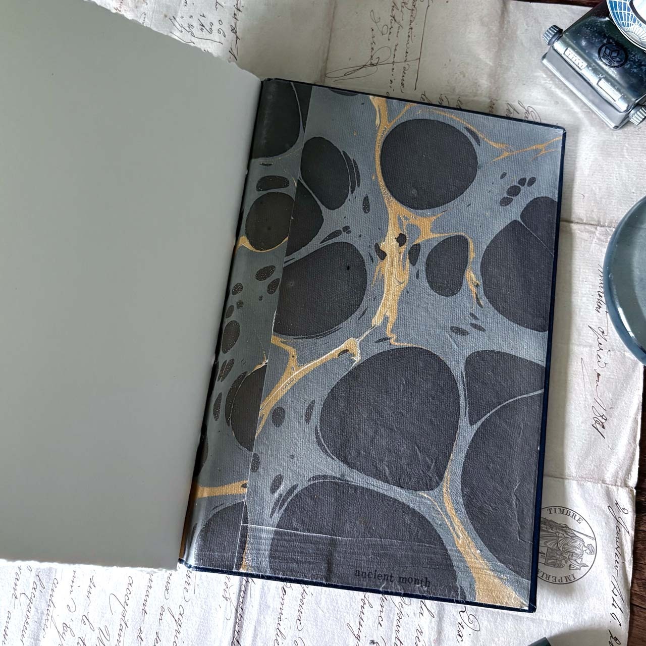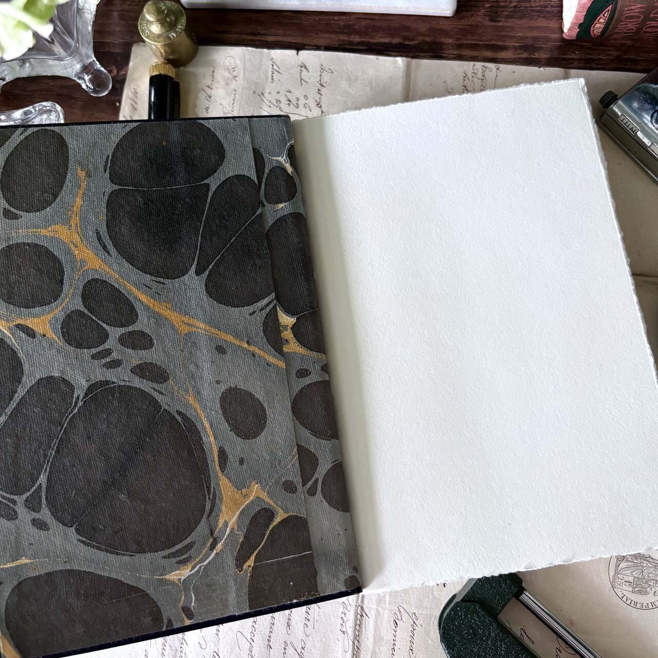 裏表紙はグレーベースの手染めマーブル紙を使用しております。