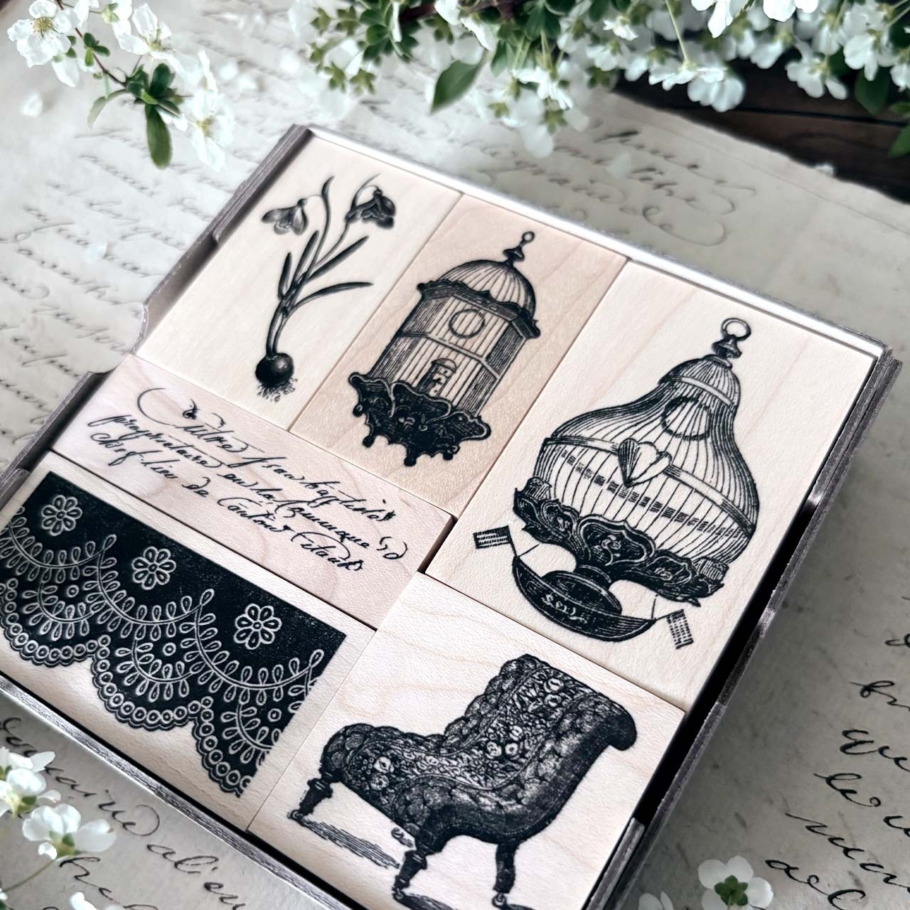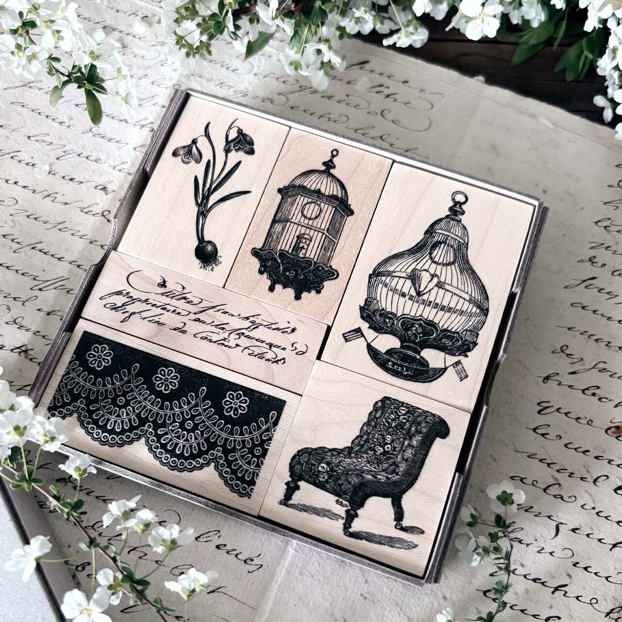 鳥籠、スノードロップ、テキスト、模様、椅子のセットになります。