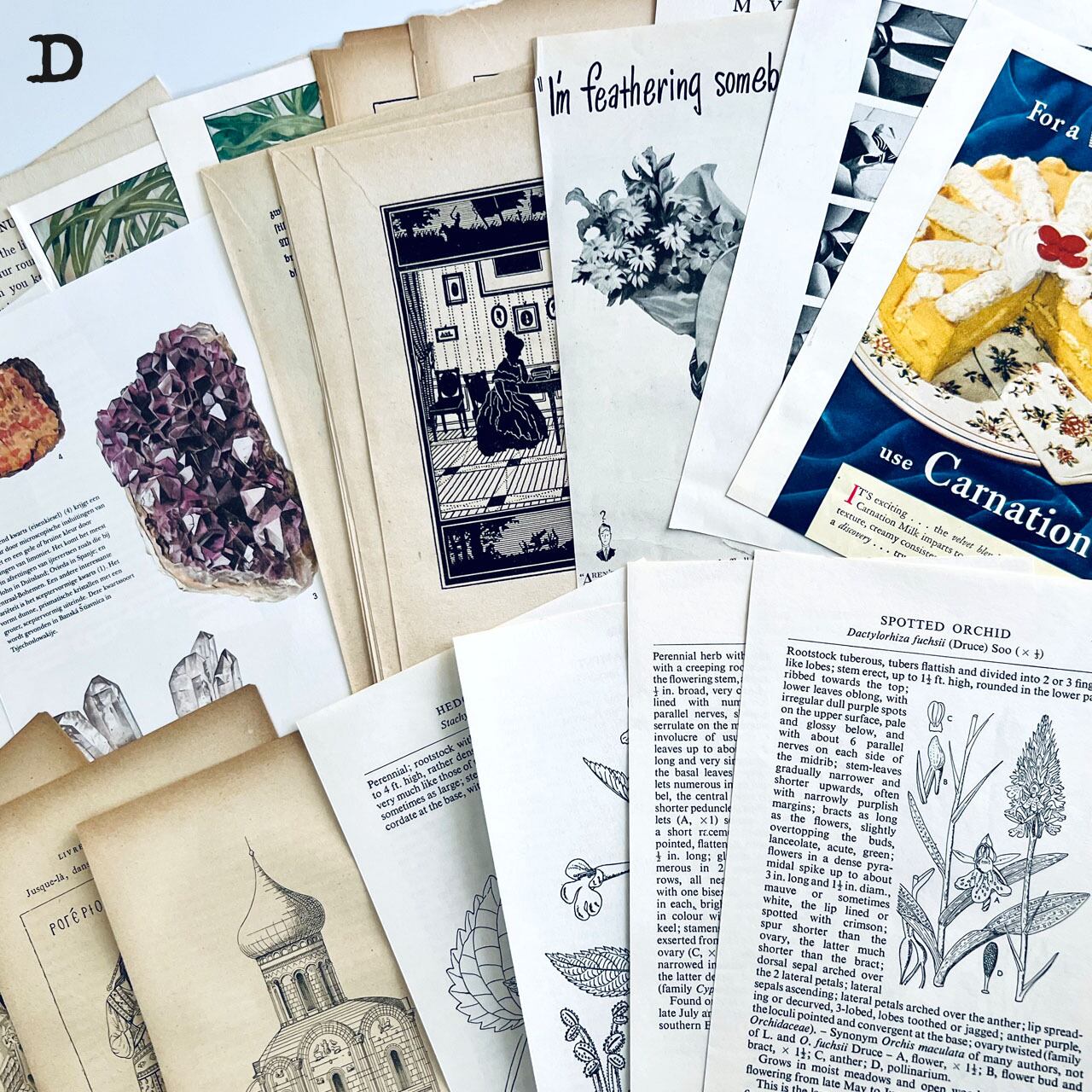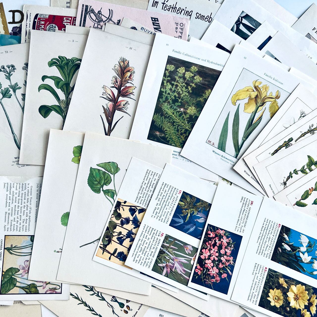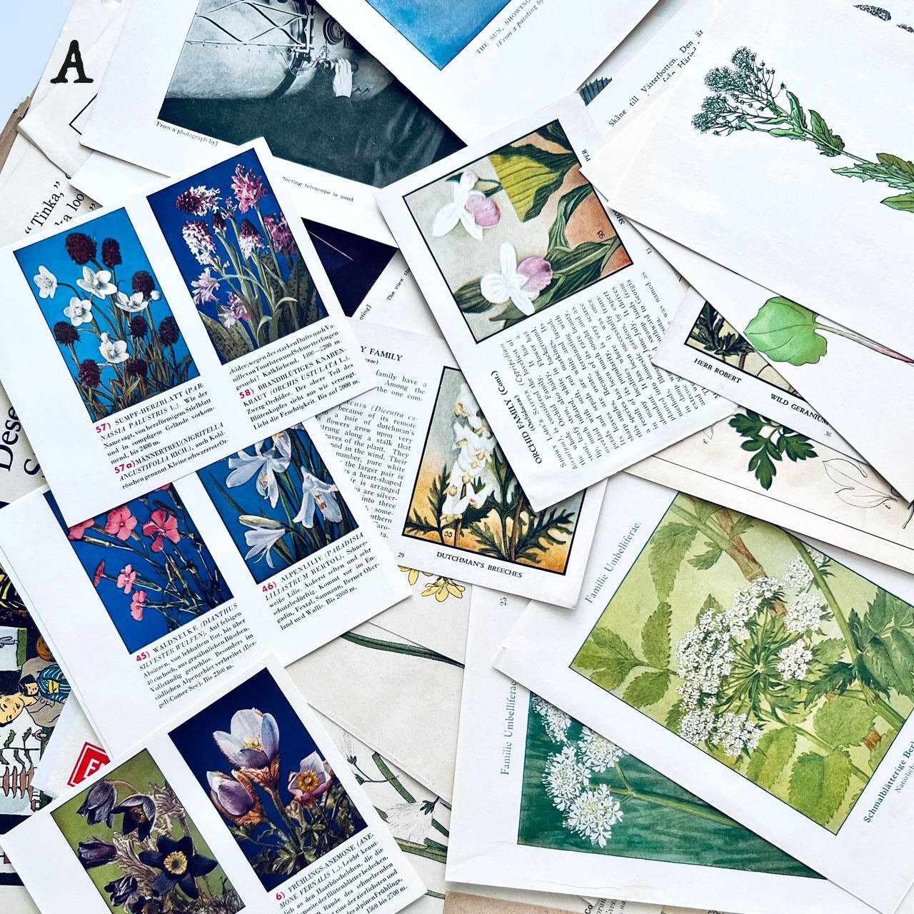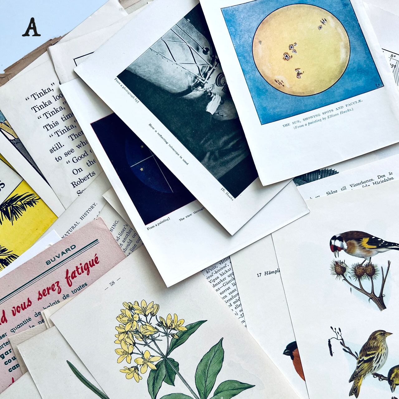 100年以上前のアンティーク図鑑や小説、ヴィンテージ図鑑、雑誌などの切り抜きが100点あまり入っている豪華なセットになっております。