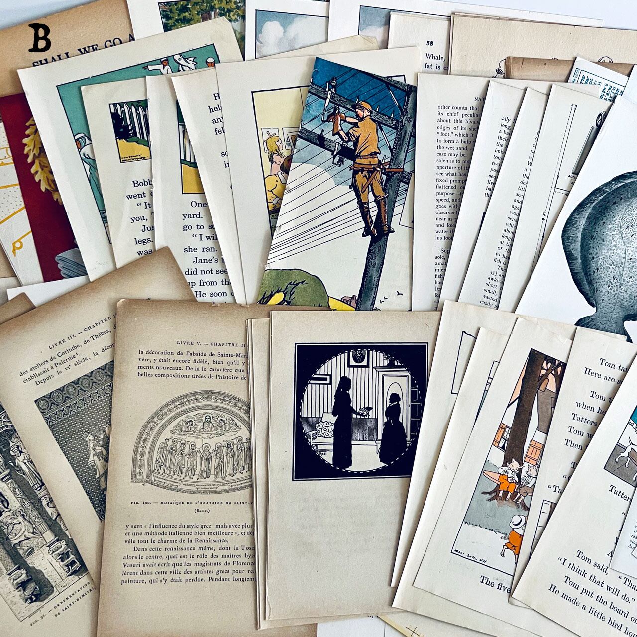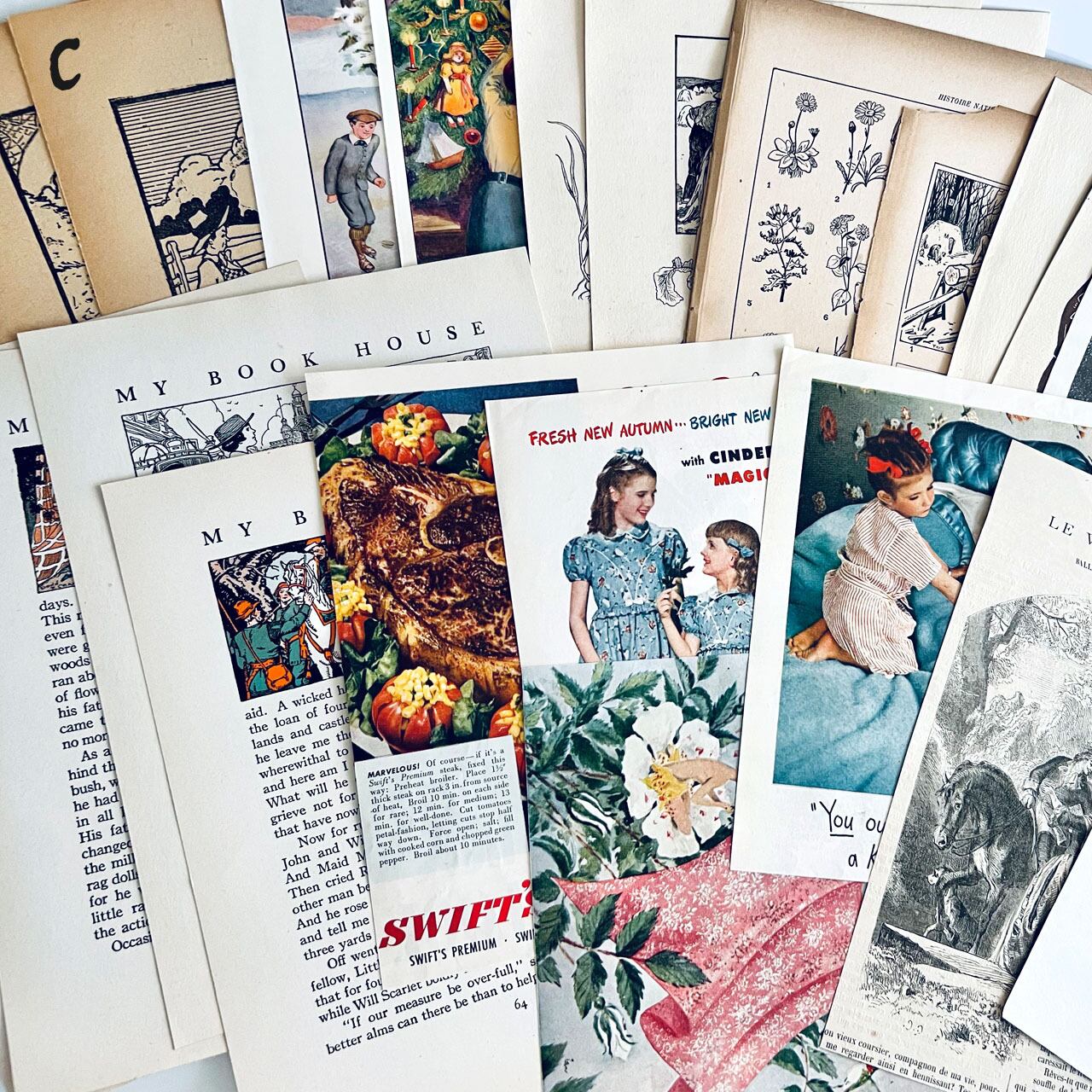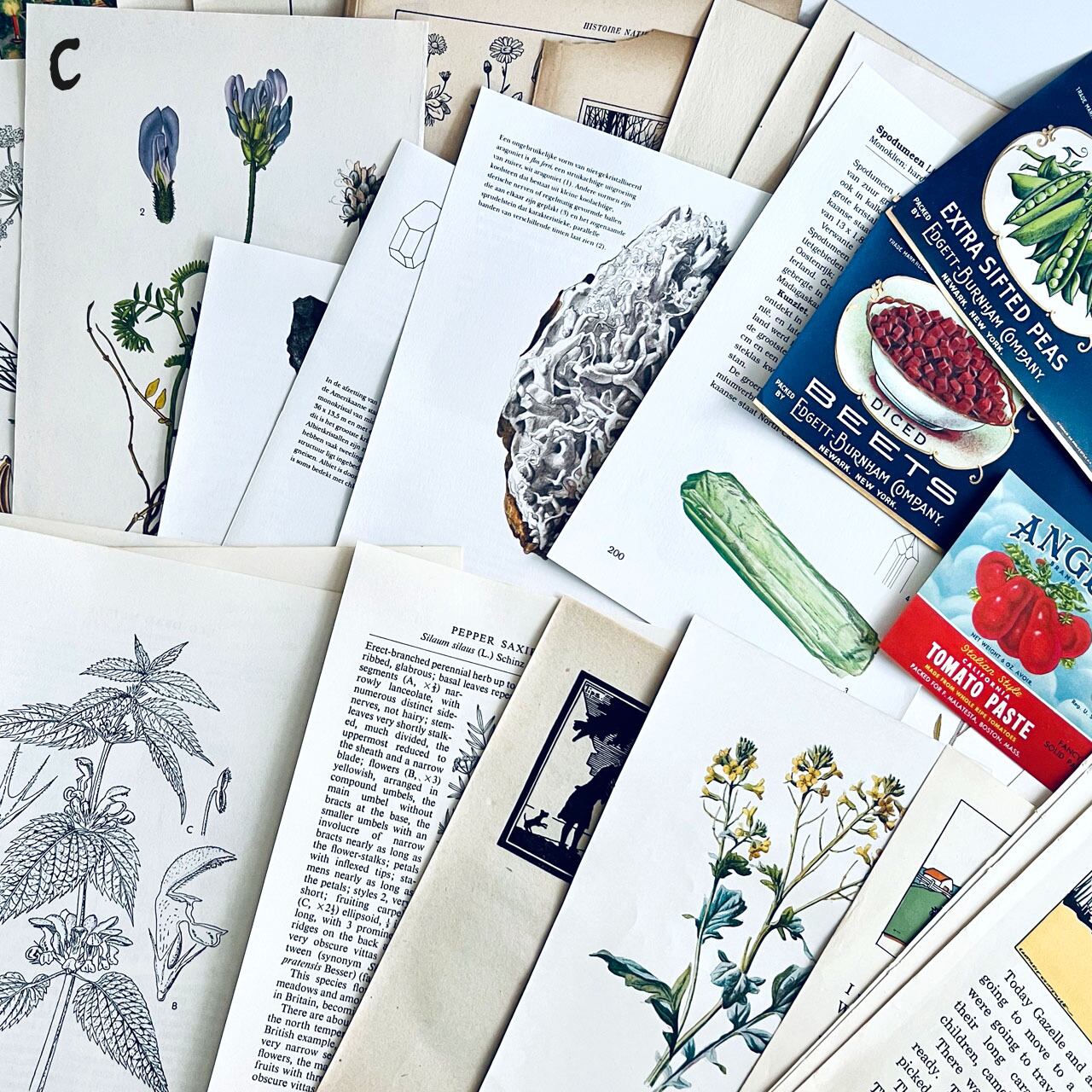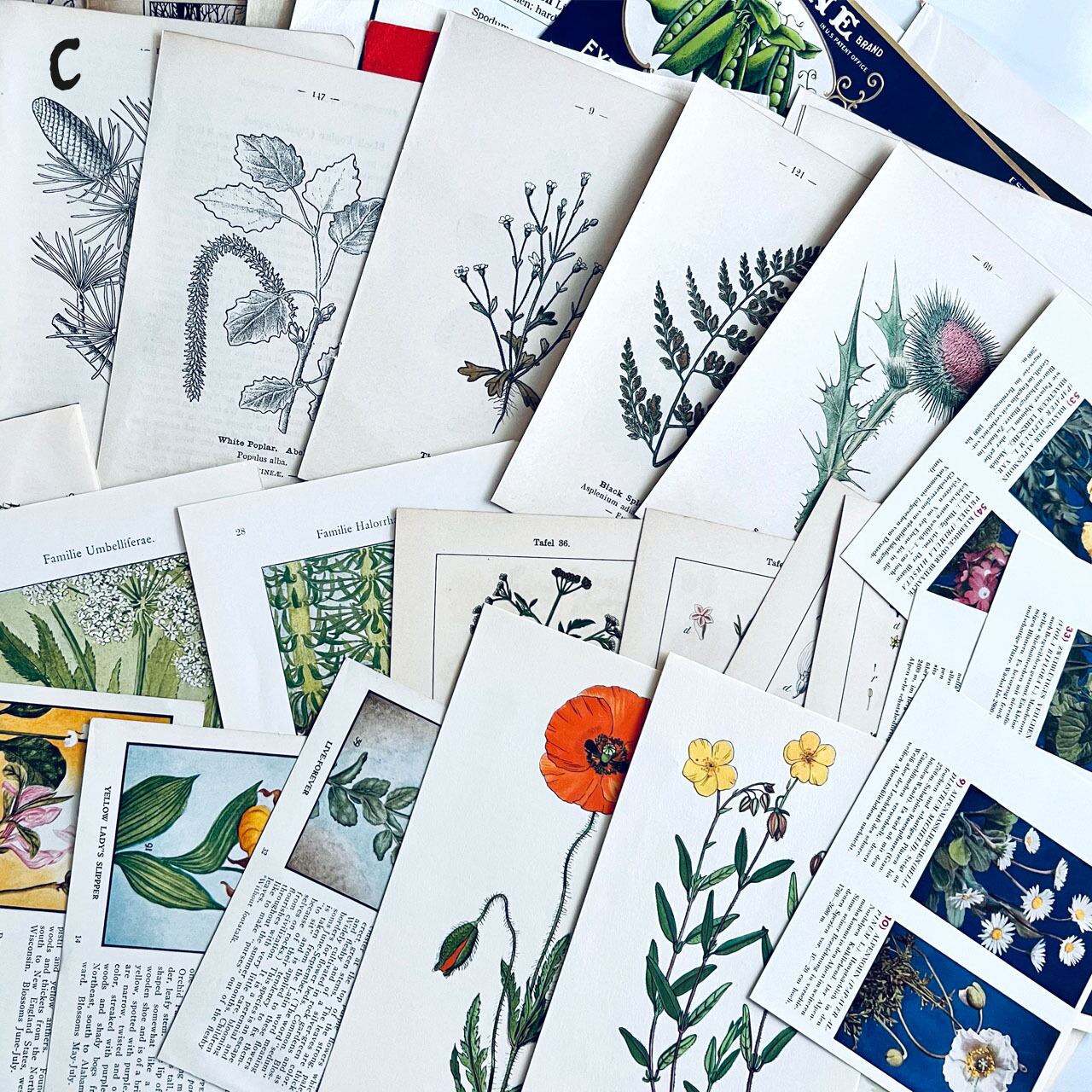 100年以上前のアンティーク図鑑や小説、ヴィンテージ図鑑、雑誌などの切り抜きが100点あまり入っている豪華なセットになっております。