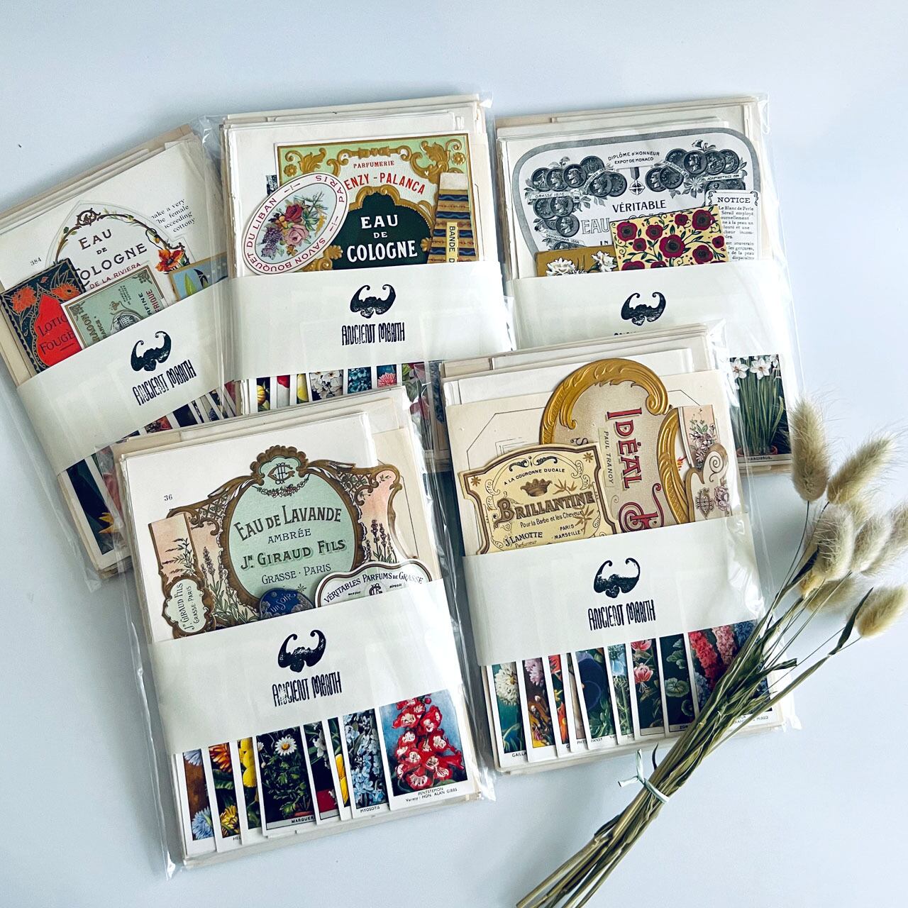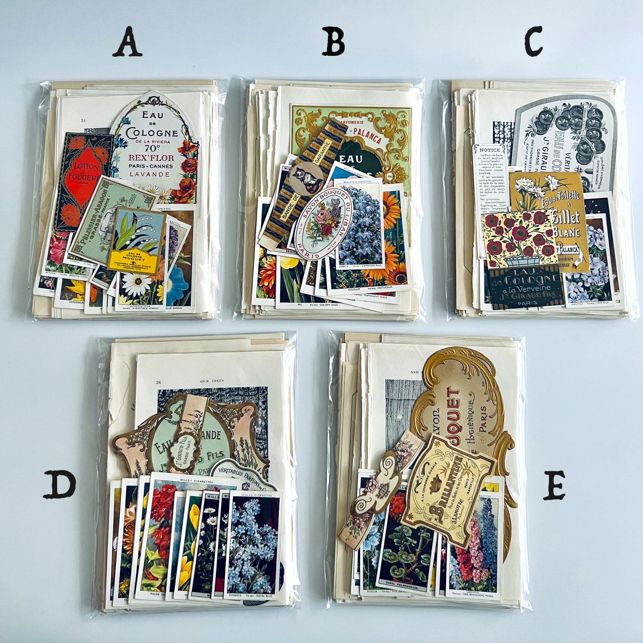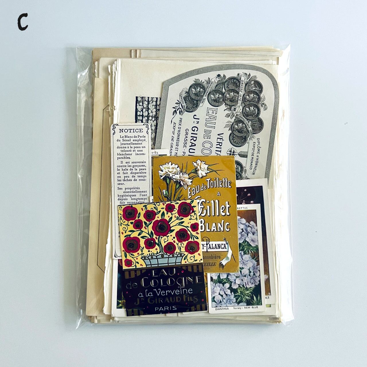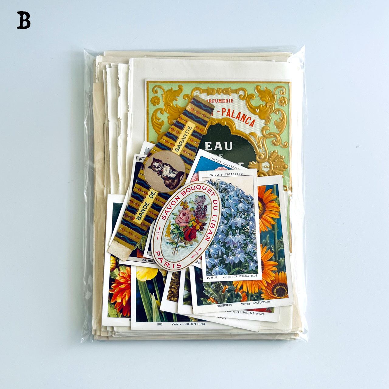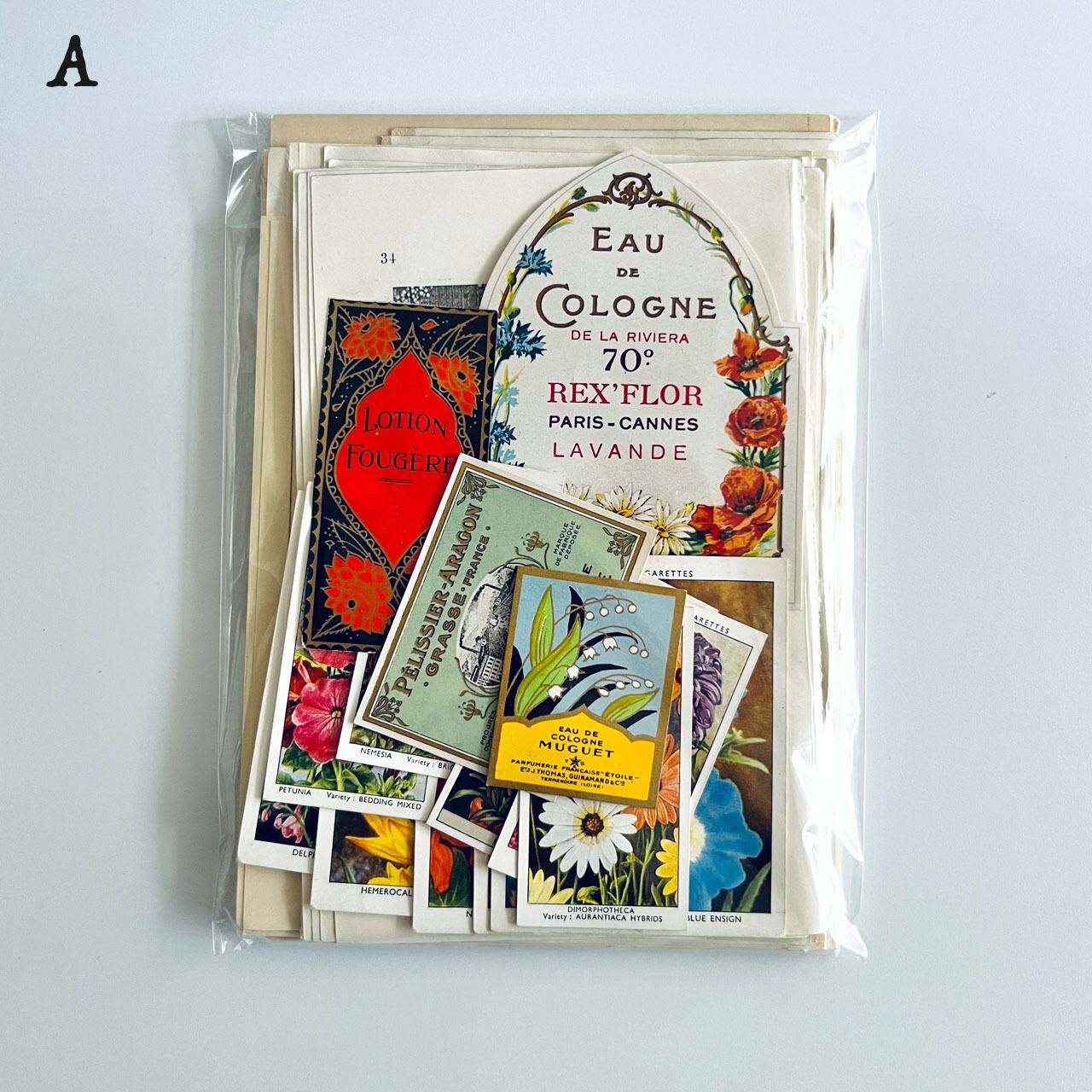 貴重なアンティーク香水ラベルやシガレットカードなども入れました。