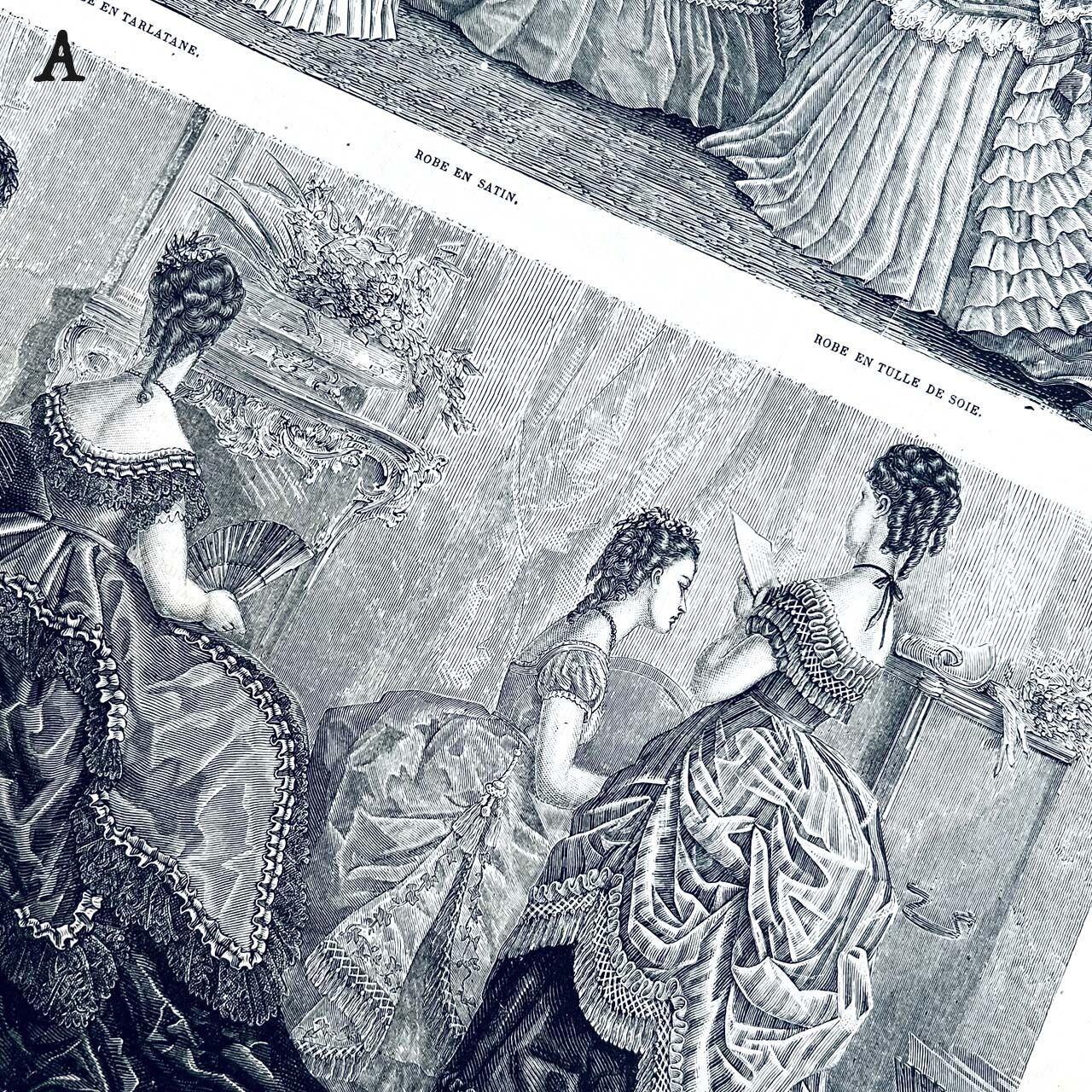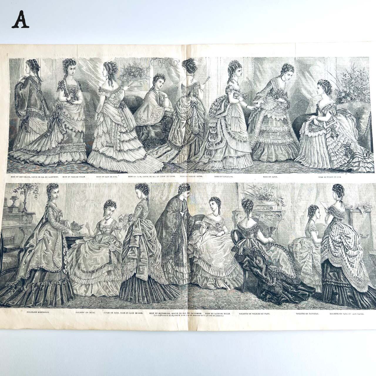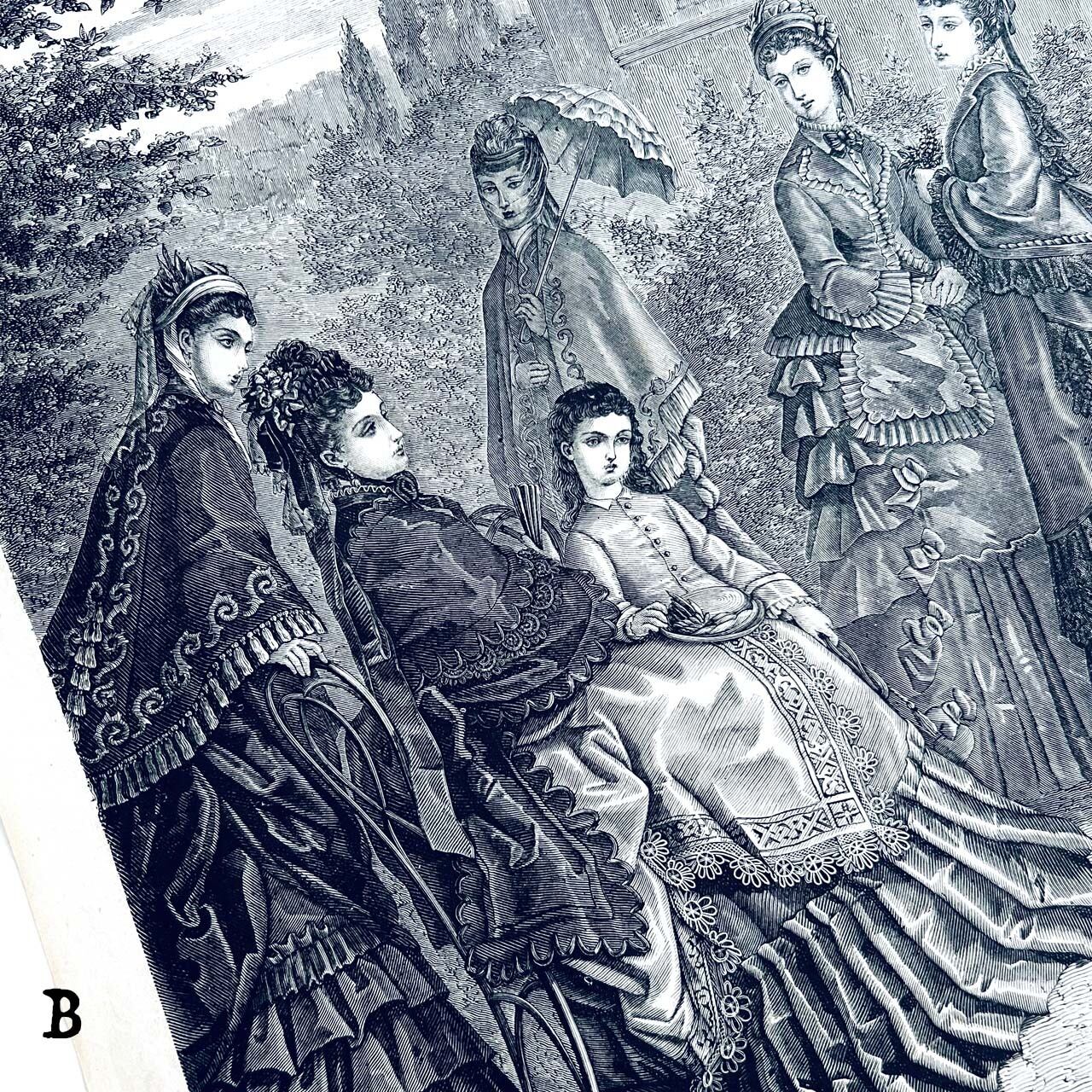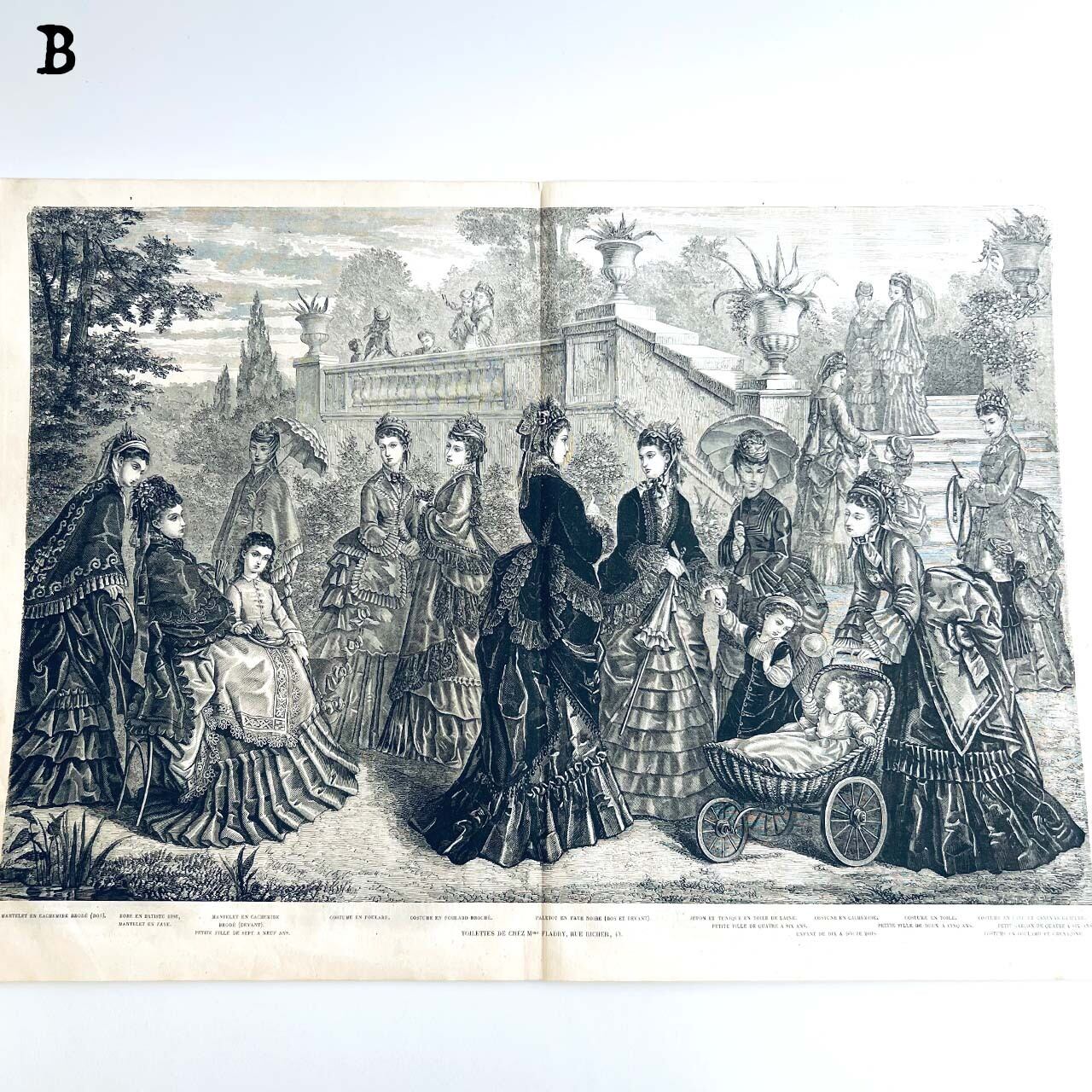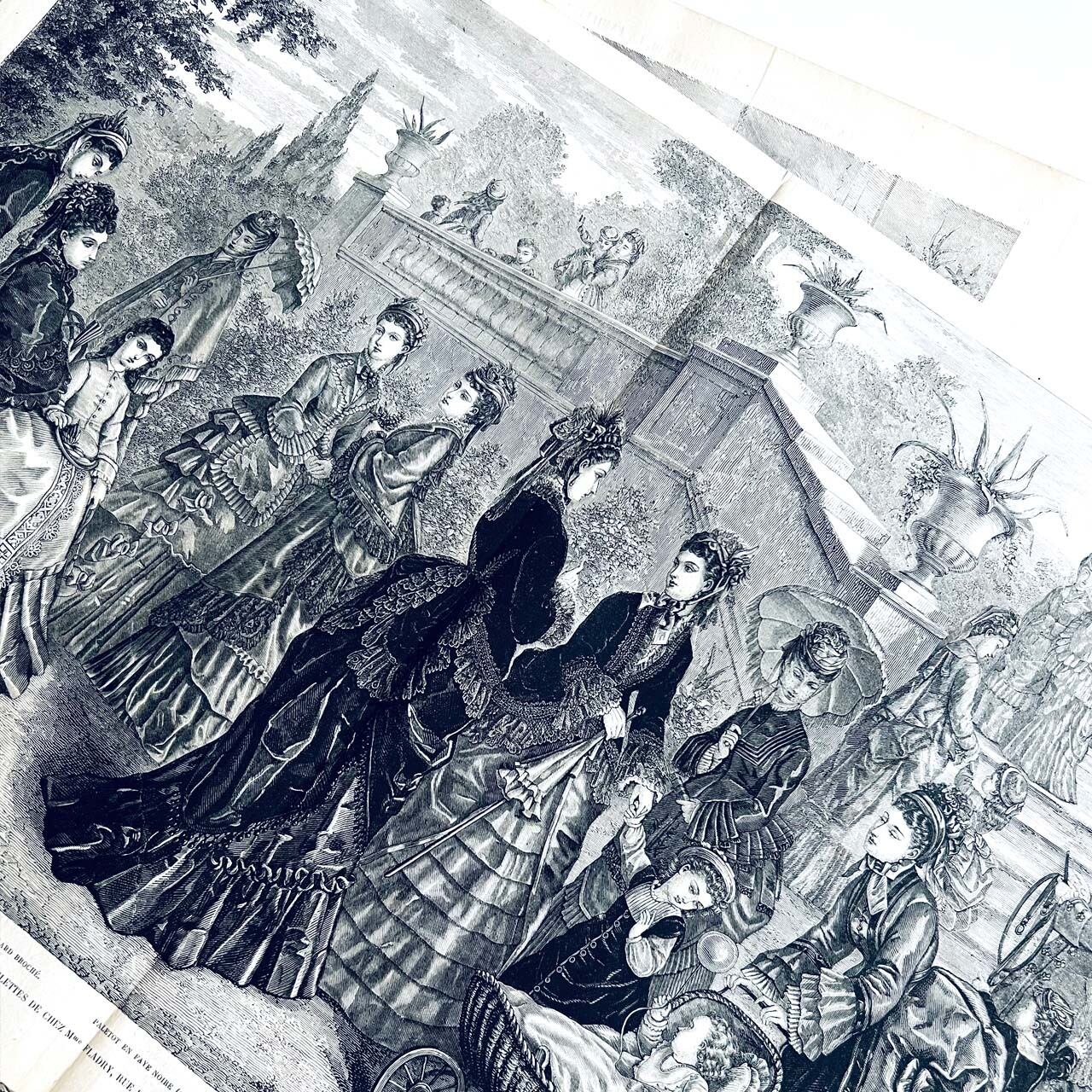 1873年ヴィクトリア時代のフランスファッション誌『 La Mode Illustree 』見開き銅版画です。