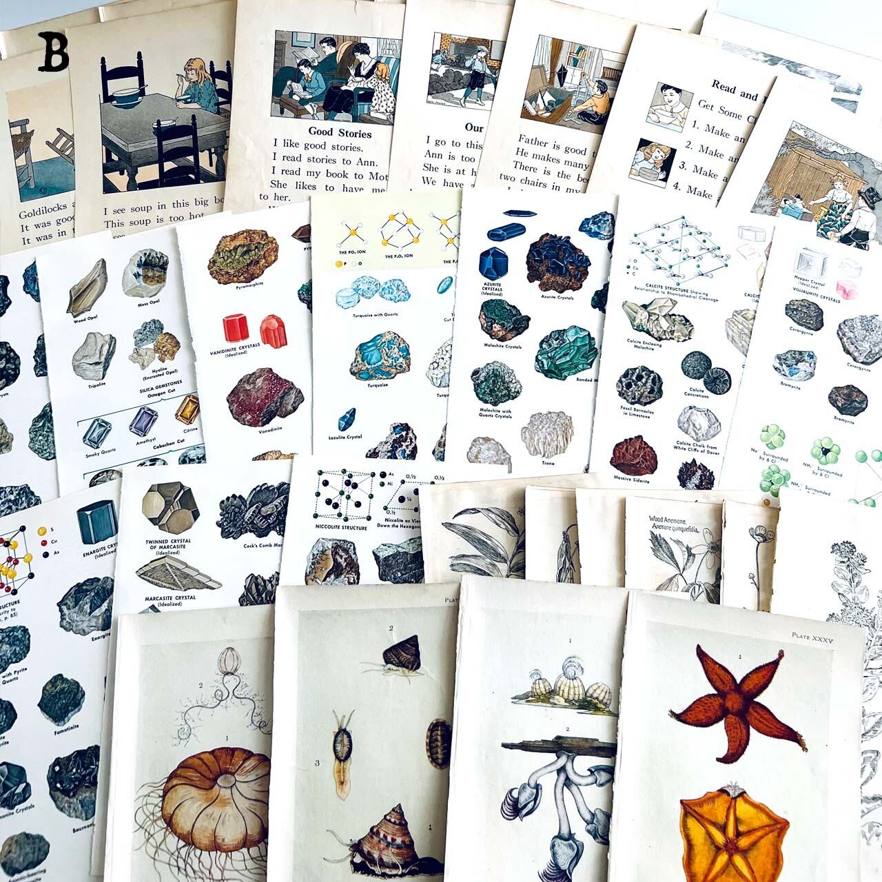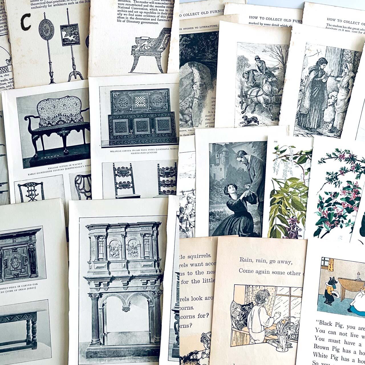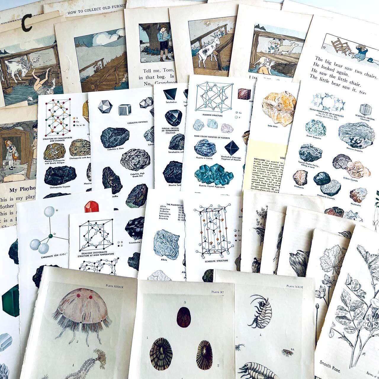 100年以上前のアンティーク、ヴィンテージ植物図鑑やアンティーク家具専門書、児童書、鉱石図鑑からの貴重な素材を集めました。