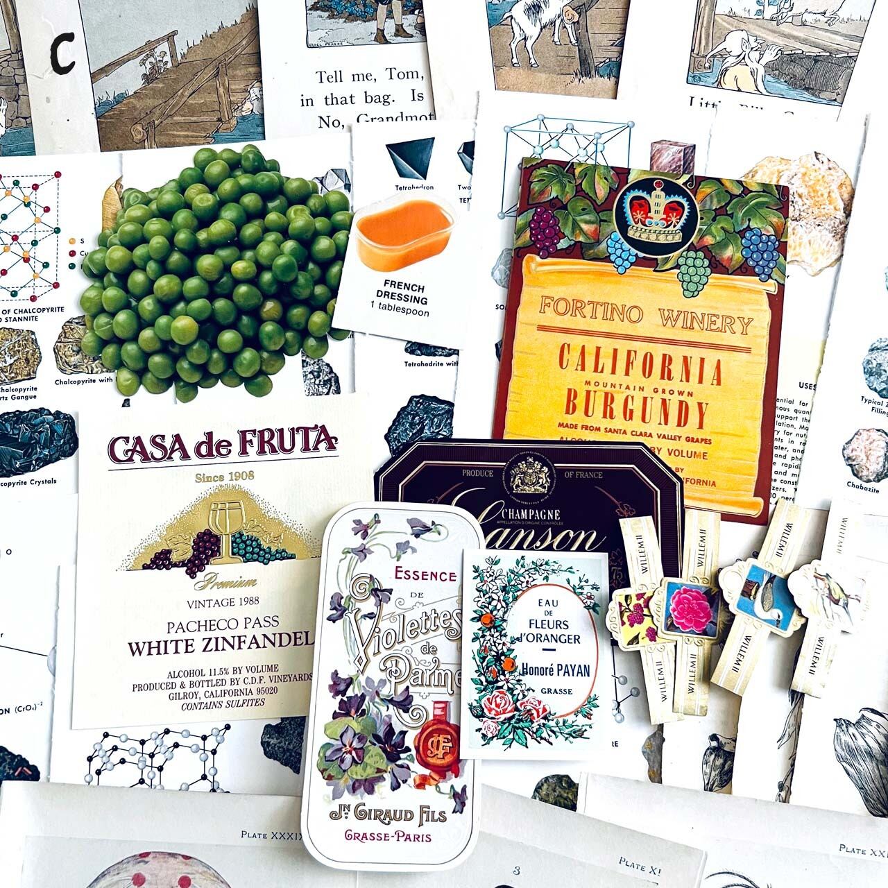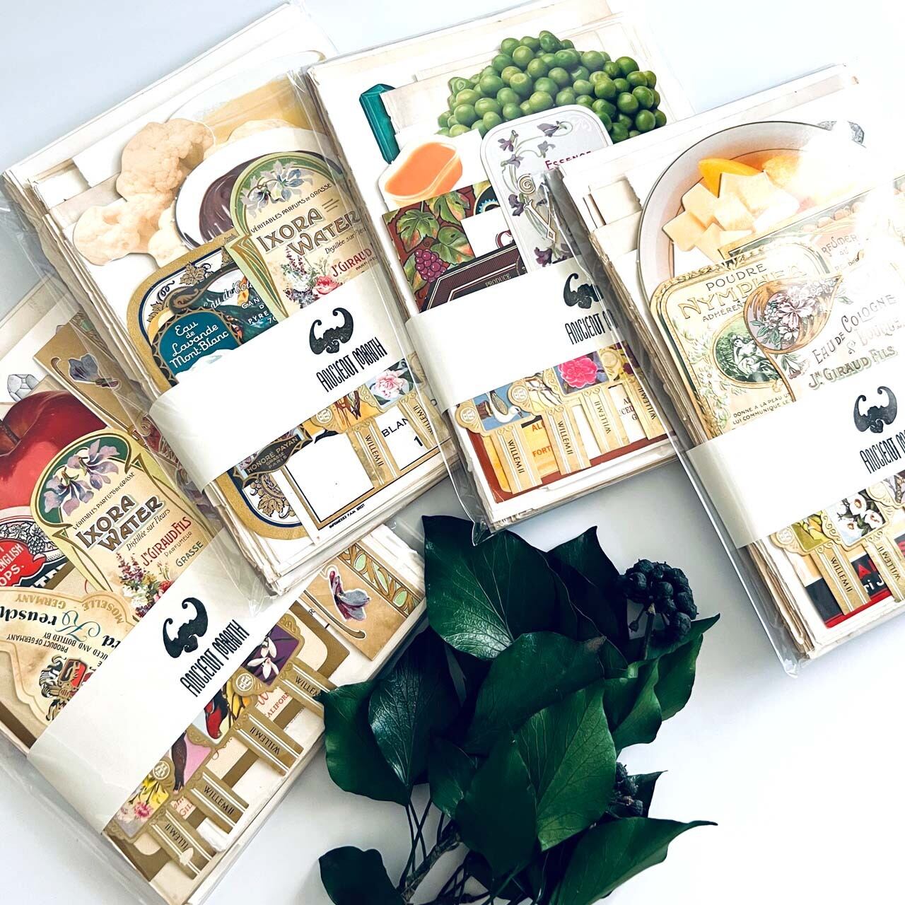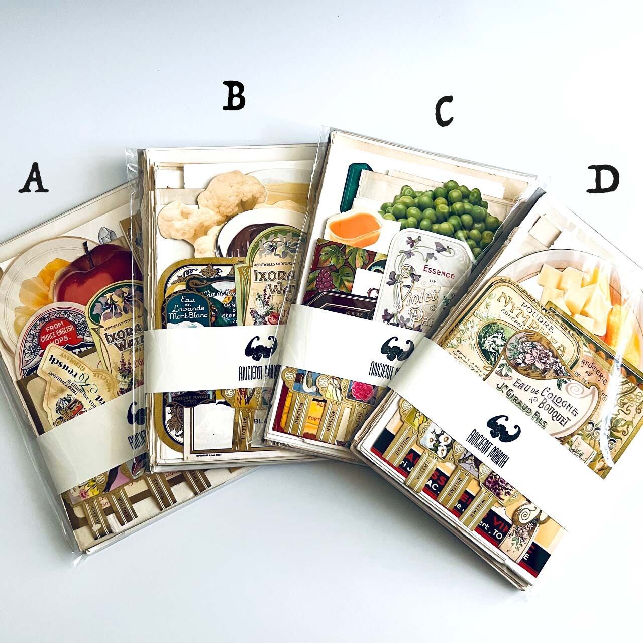 大変珍しいヴィンテージスクールフードカードや豪華な香水ラベル、シガレットラベル、ワインラベルなど一枚で数千円する素材も入っております。