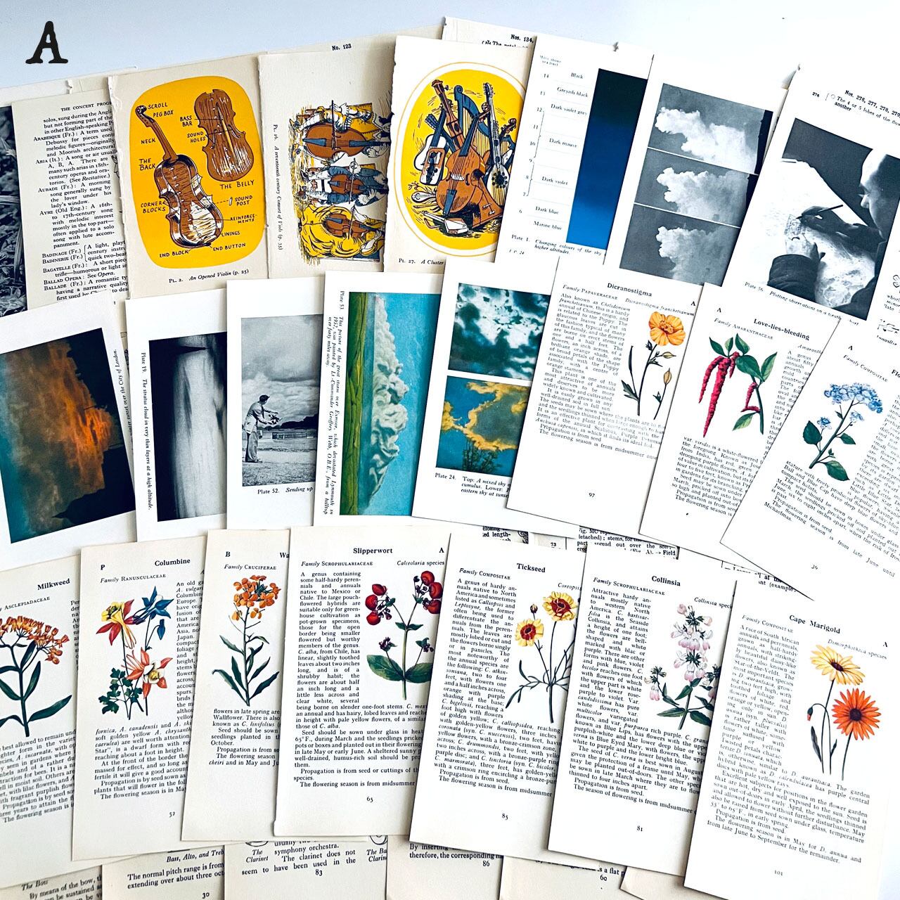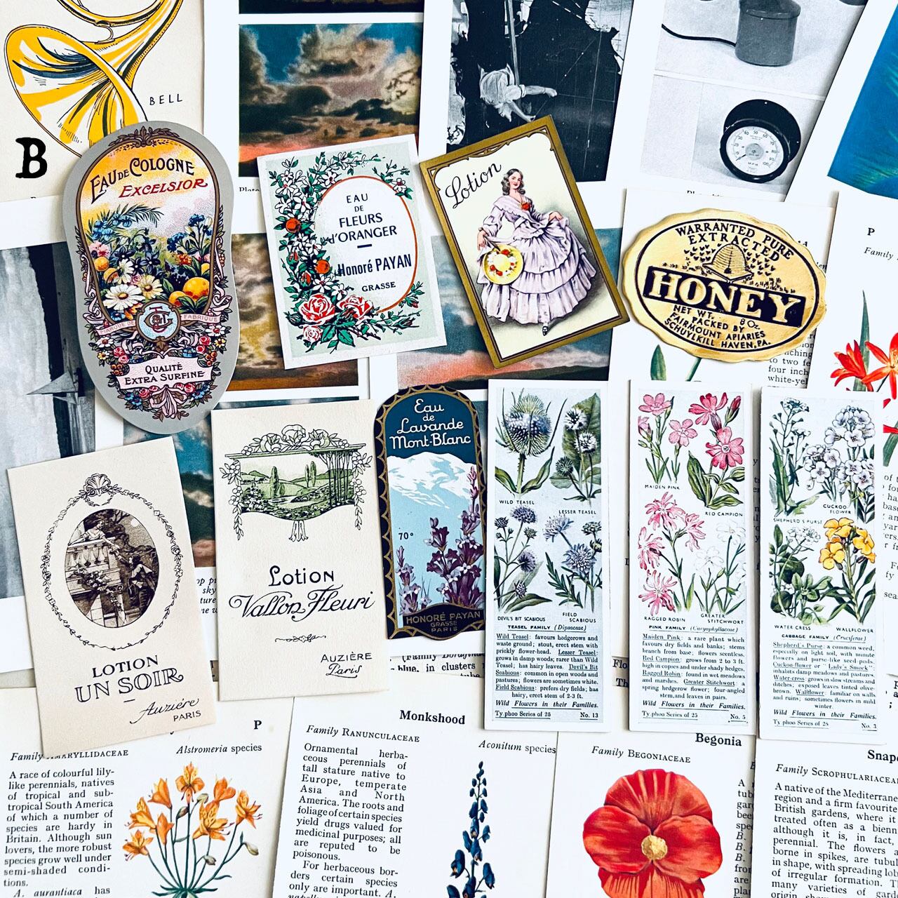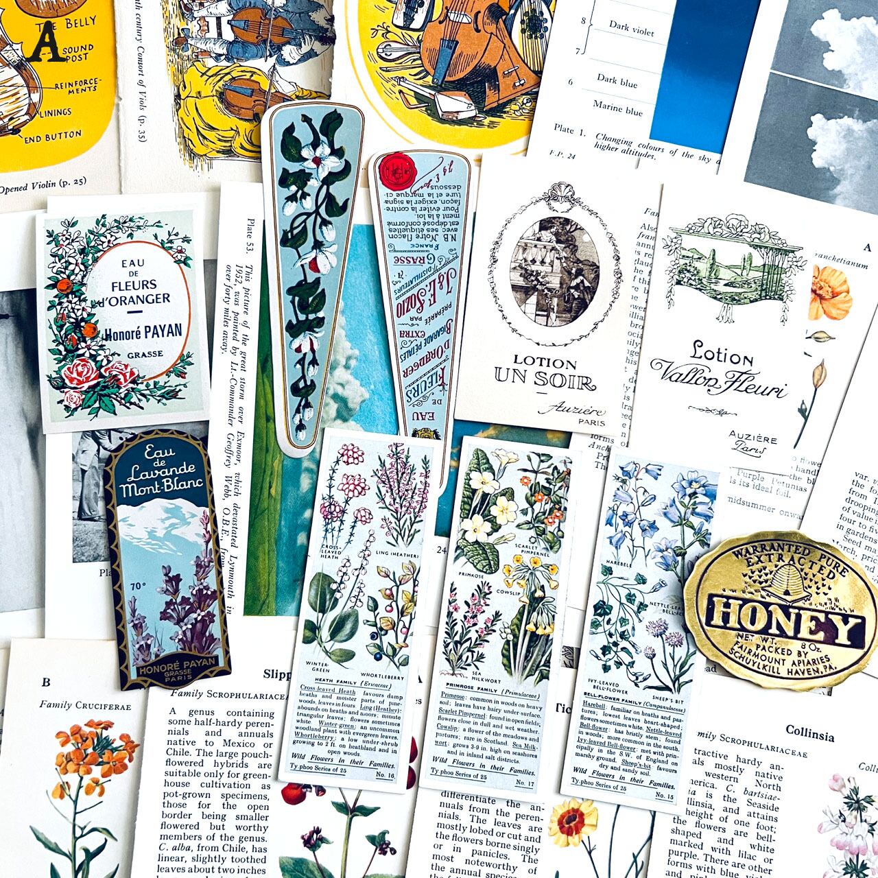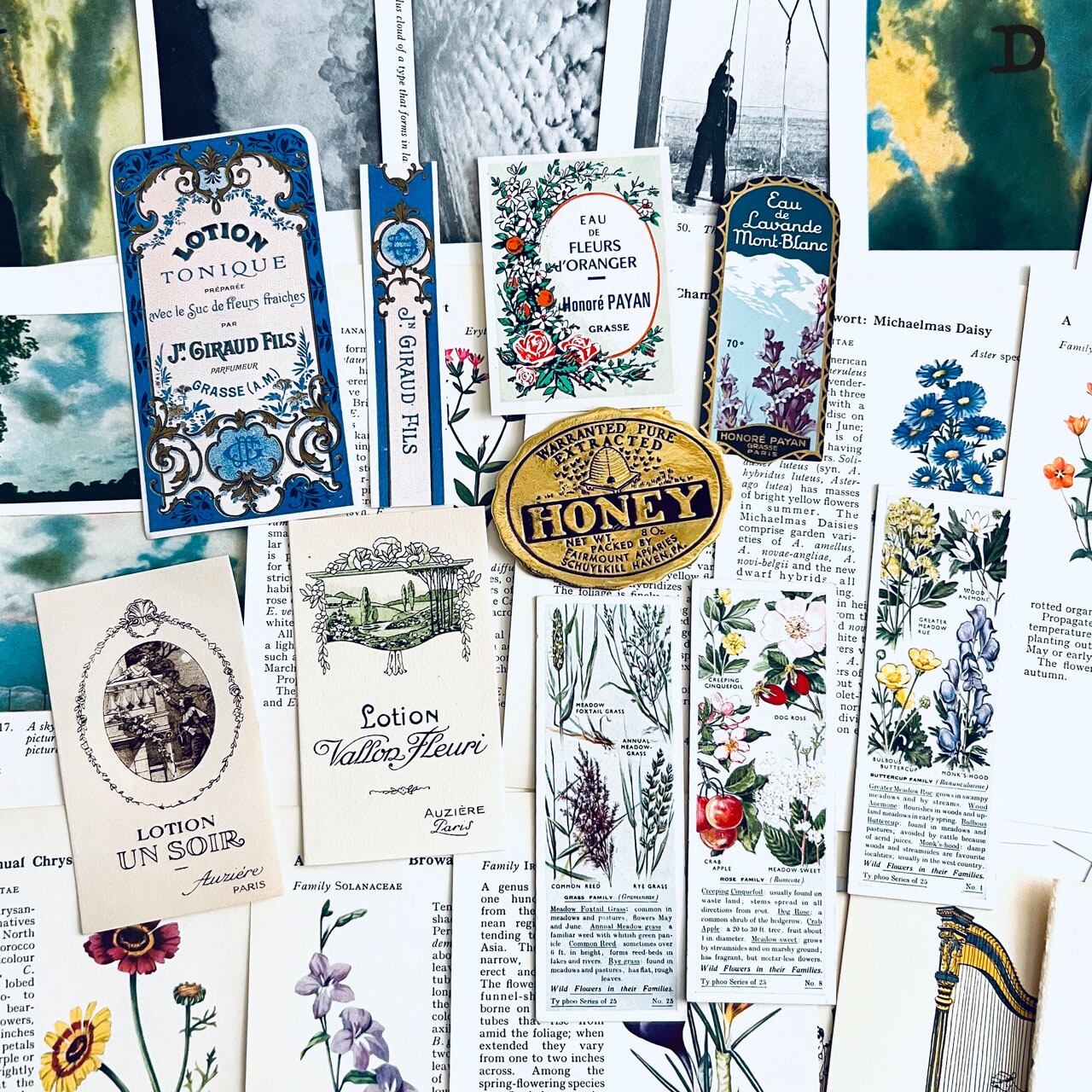 アンティーク、ヴィンテージ植物図鑑やアンティーク天候書、音楽書からの貴重な素材を集めました。豪華な香水ラベル、シガレットラベル、ワインラベル、珍しいタイプのティーカードなど一枚で数千円する素材も入っております。