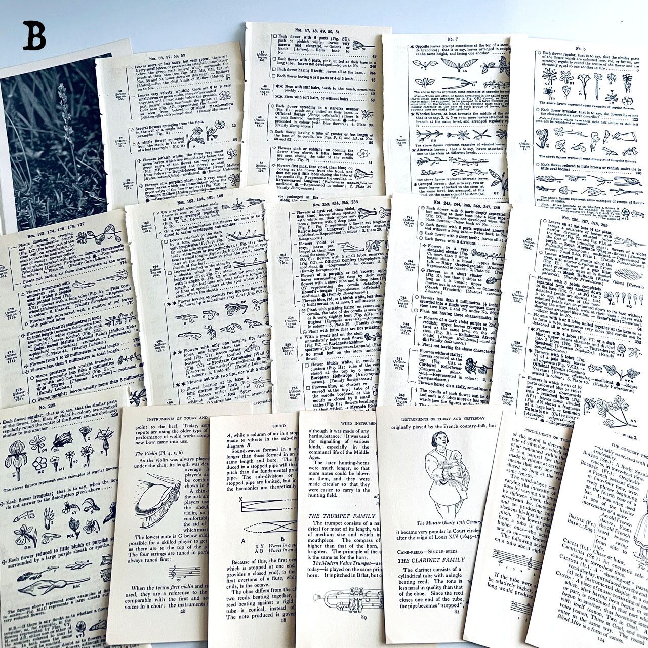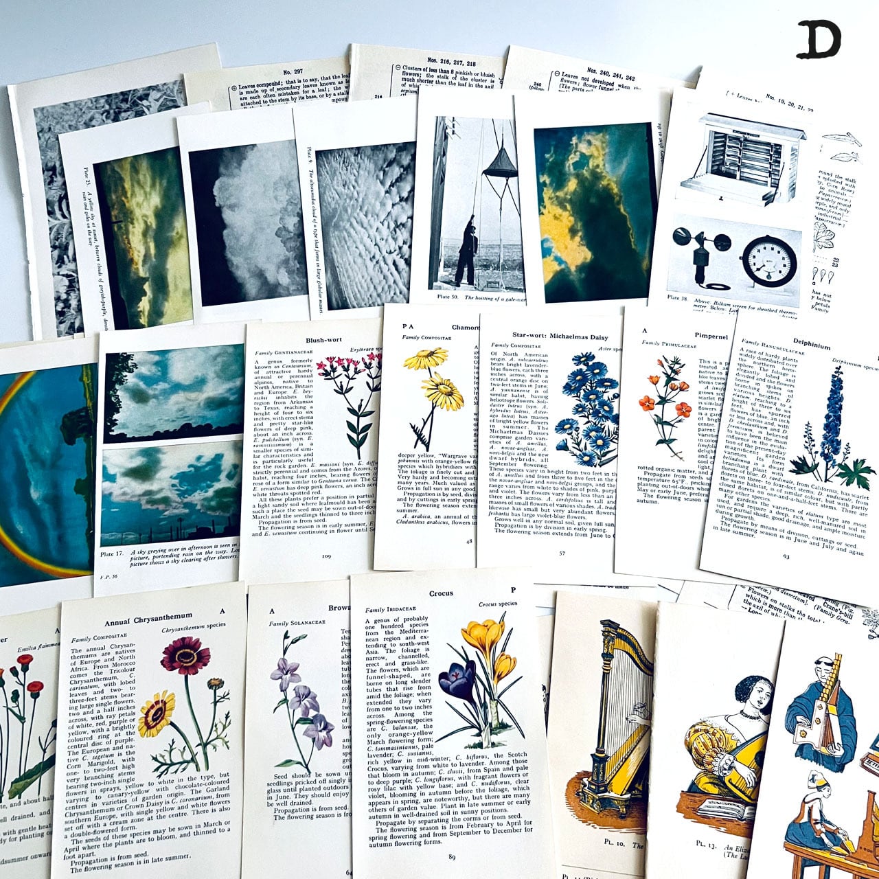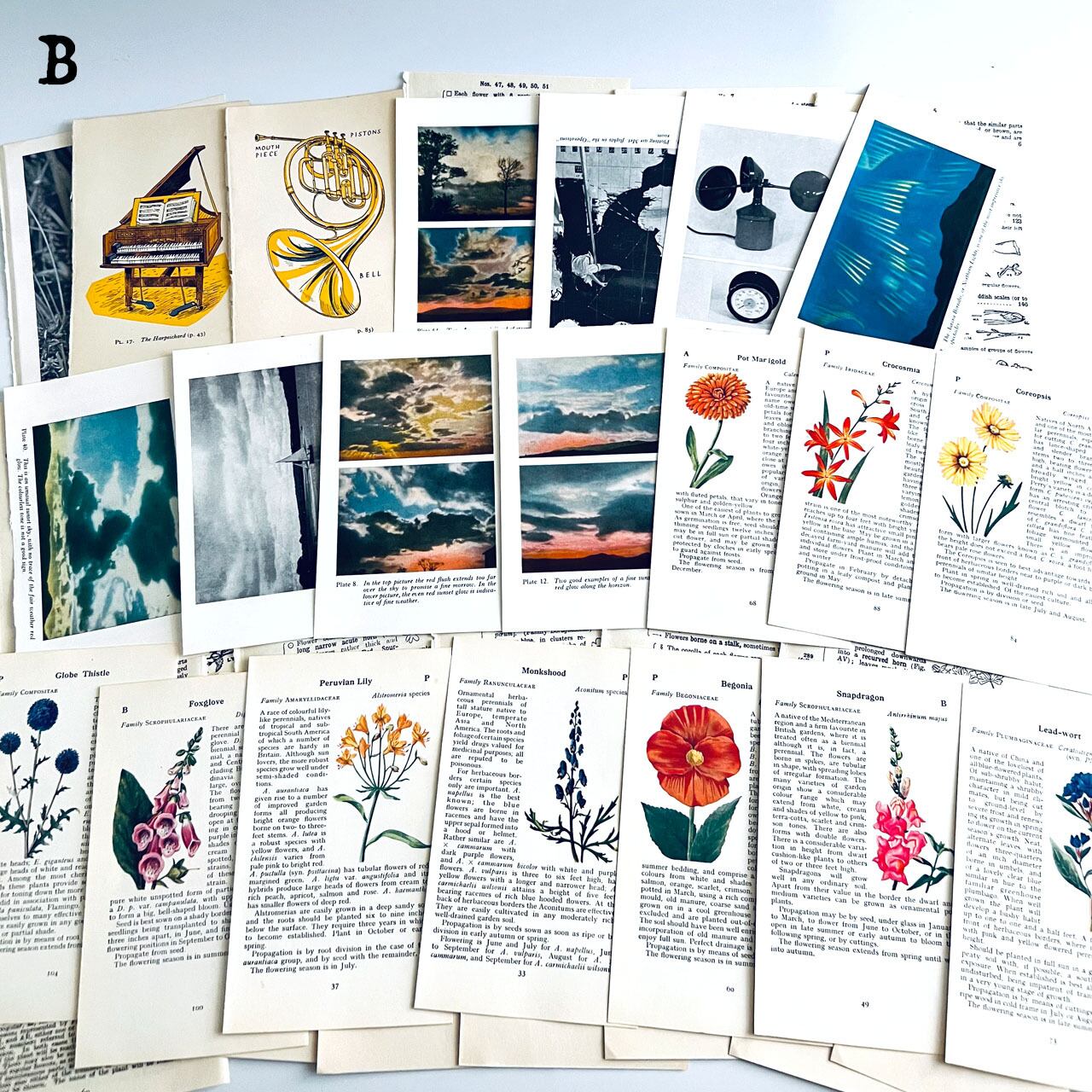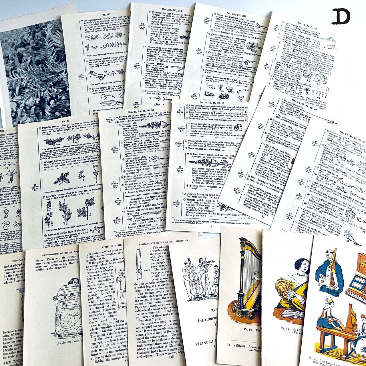 アンティーク、ヴィンテージ植物図鑑やアンティーク天候書、音楽書からの貴重な素材を集めました。豪華な香水ラベル、シガレットラベル、ワインラベル、珍しいタイプのティーカードなど一枚で数千円する素材も入っております。