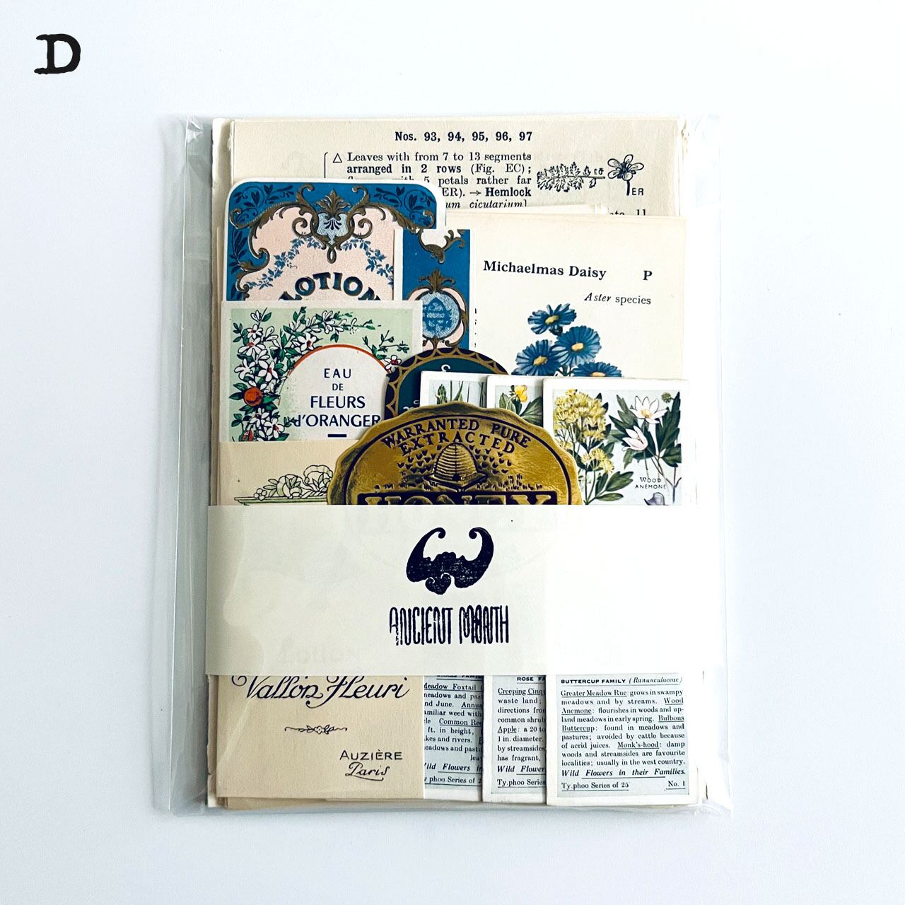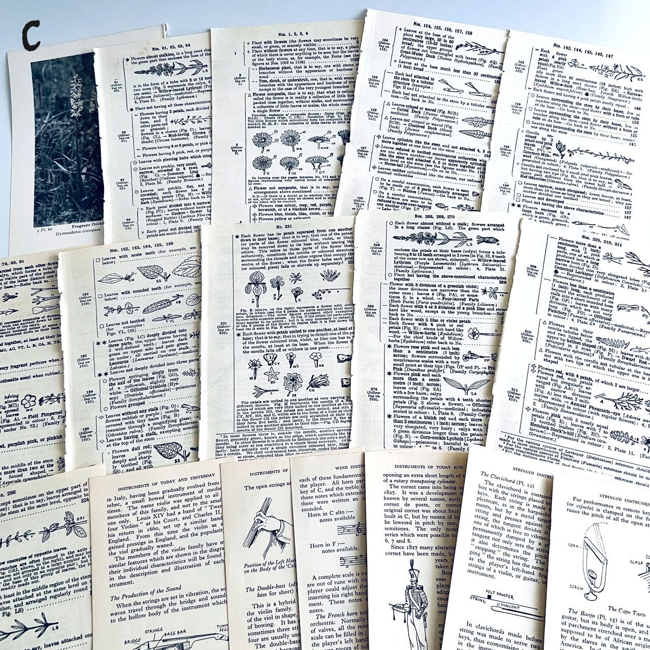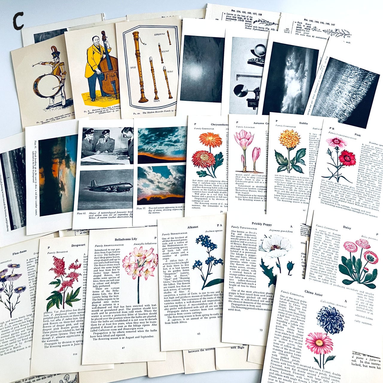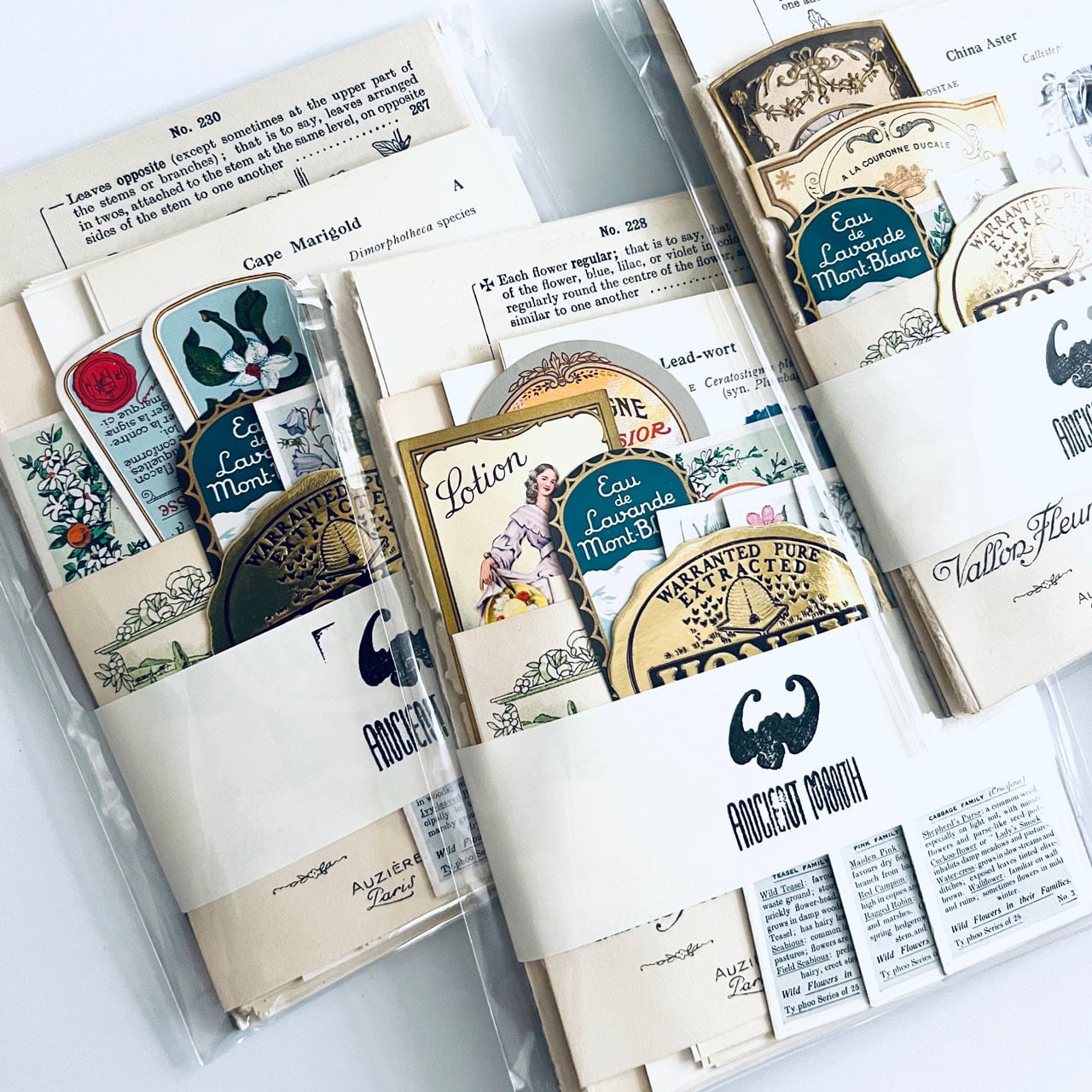 アンティーク、ヴィンテージ植物図鑑やアンティーク天候書、音楽書からの貴重な素材を集めました。豪華な香水ラベル、シガレットラベル、ワインラベル、珍しいタイプのティーカードなど一枚で数千円する素材も入っております。