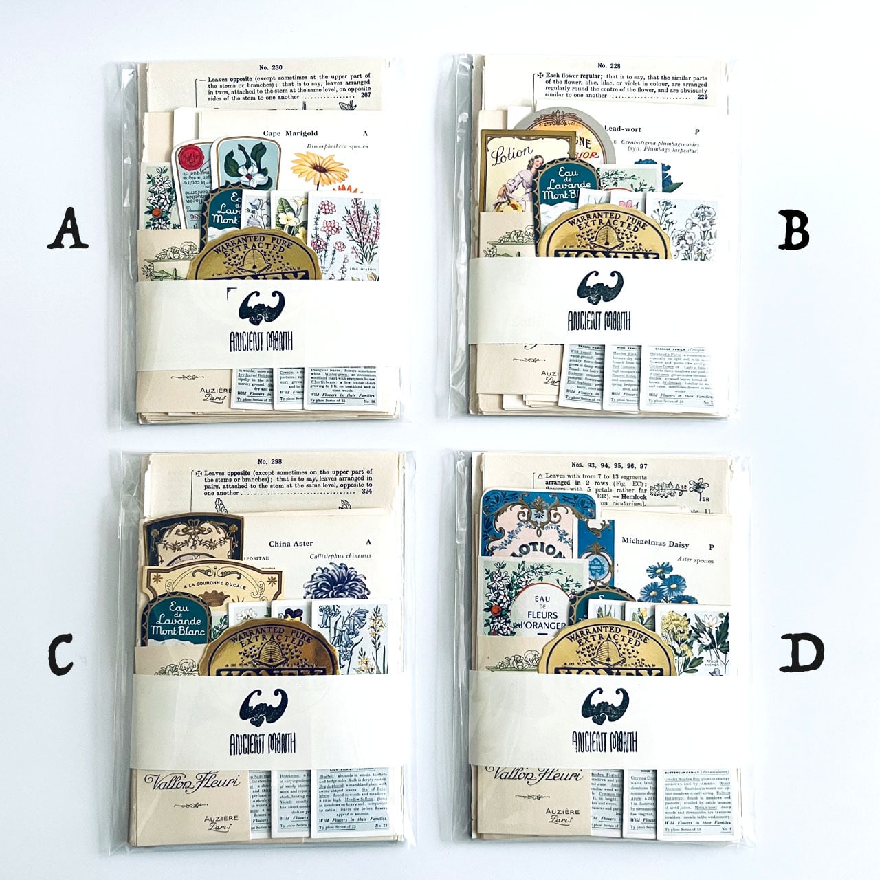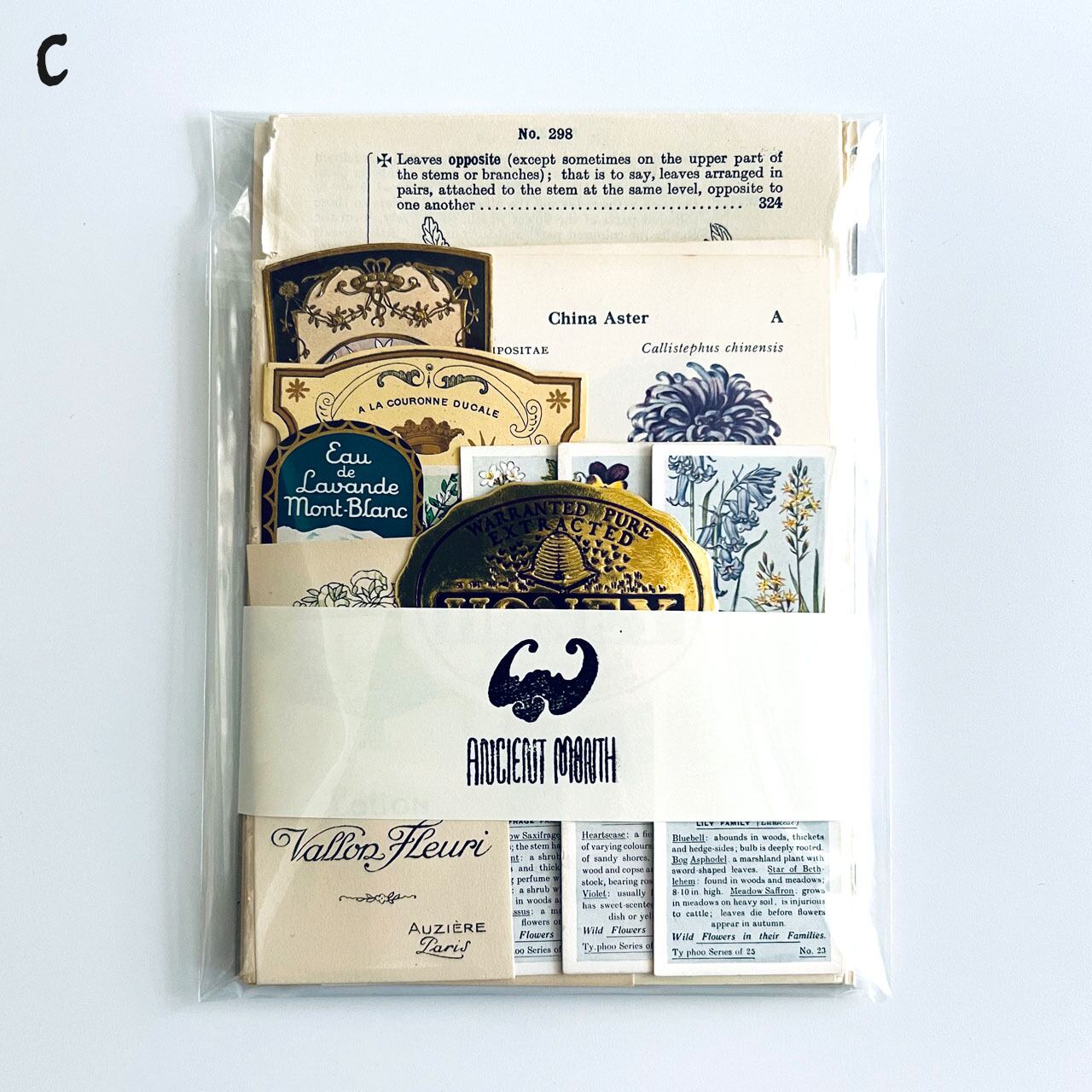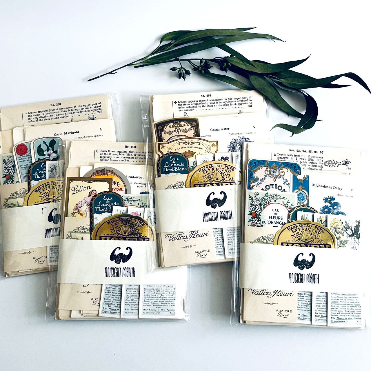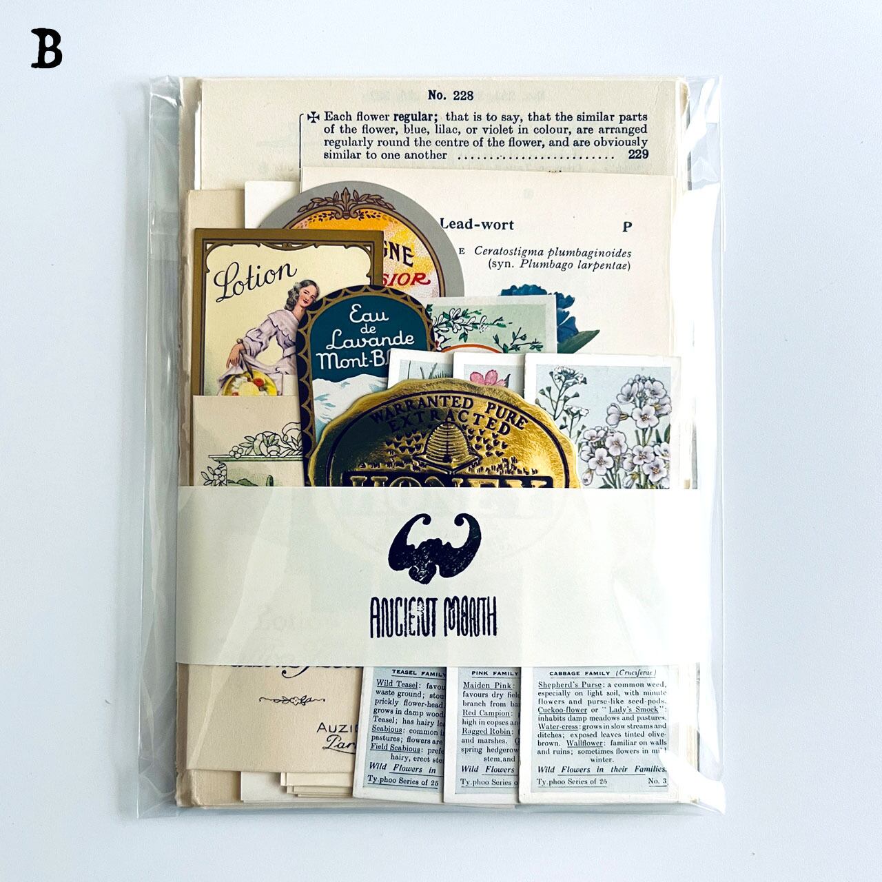 アンティーク、ヴィンテージ植物図鑑やアンティーク天候書、音楽書からの貴重な素材を集めました。豪華な香水ラベル、シガレットラベル、ワインラベル、珍しいタイプのティーカードなど一枚で数千円する素材も入っております。