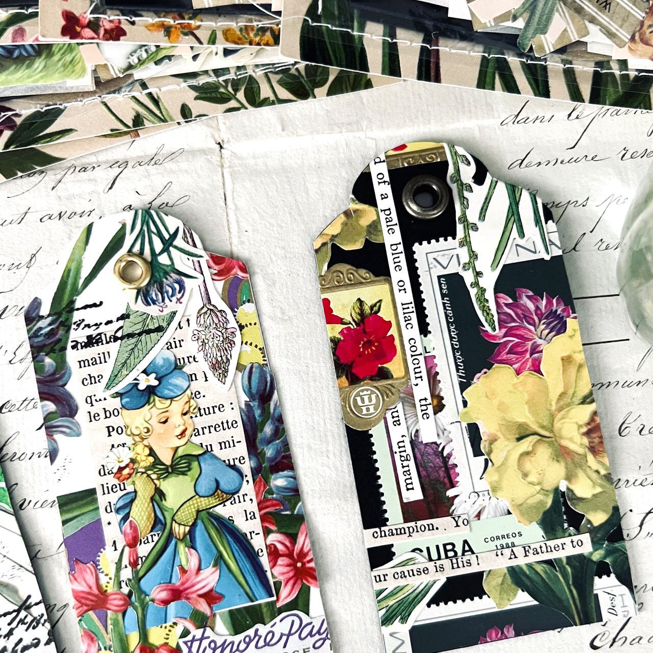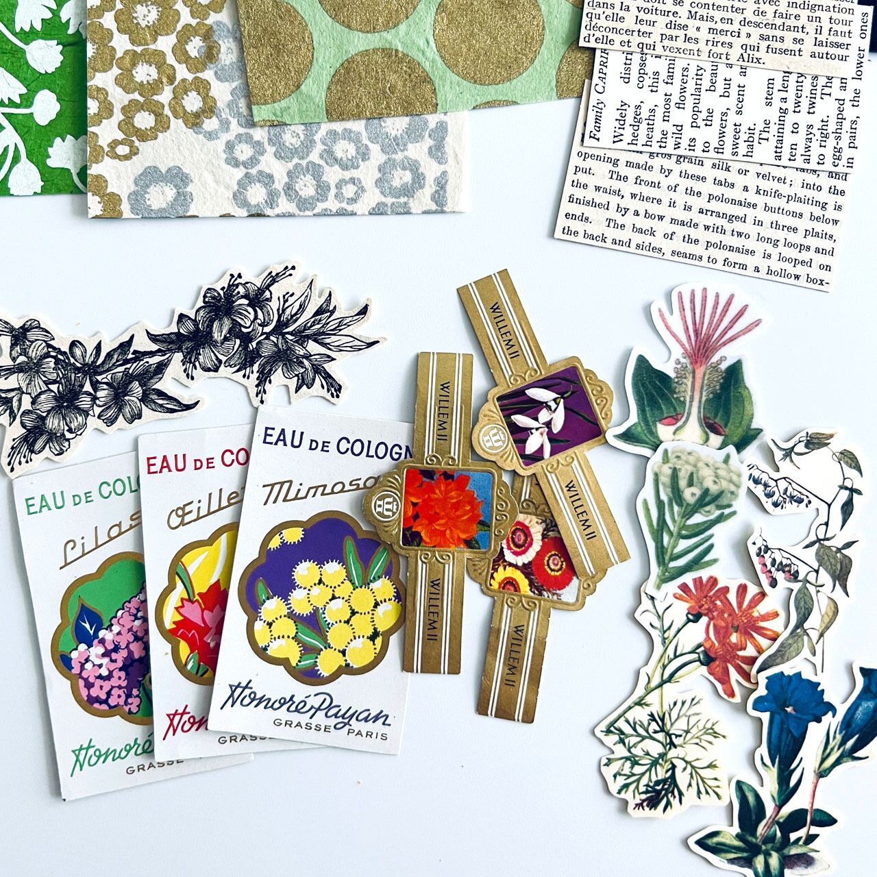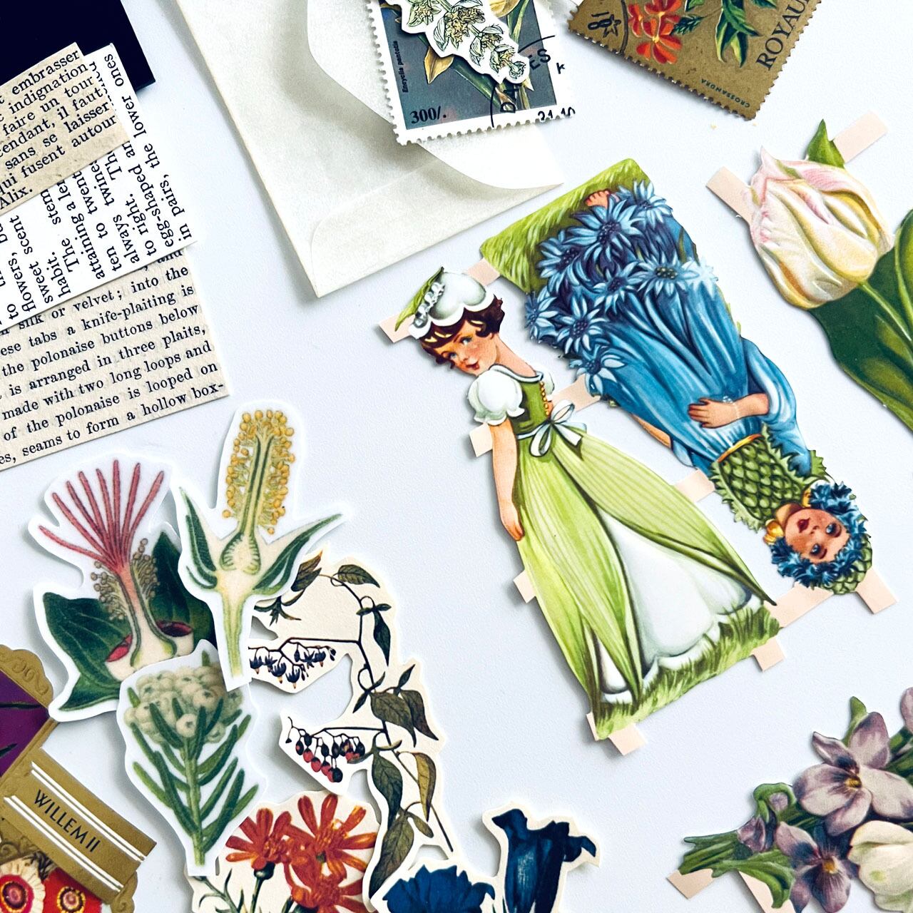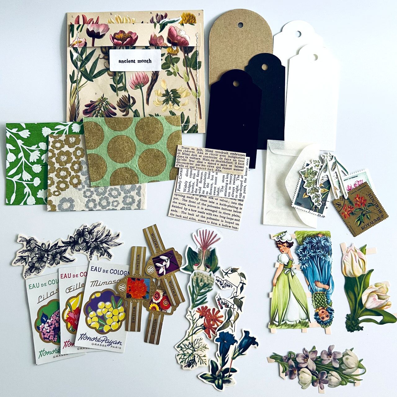 数枚のタグと色々なボタニカルなヴィンテージ切手、切り抜き、チケット、コロモスなどを詰めました。