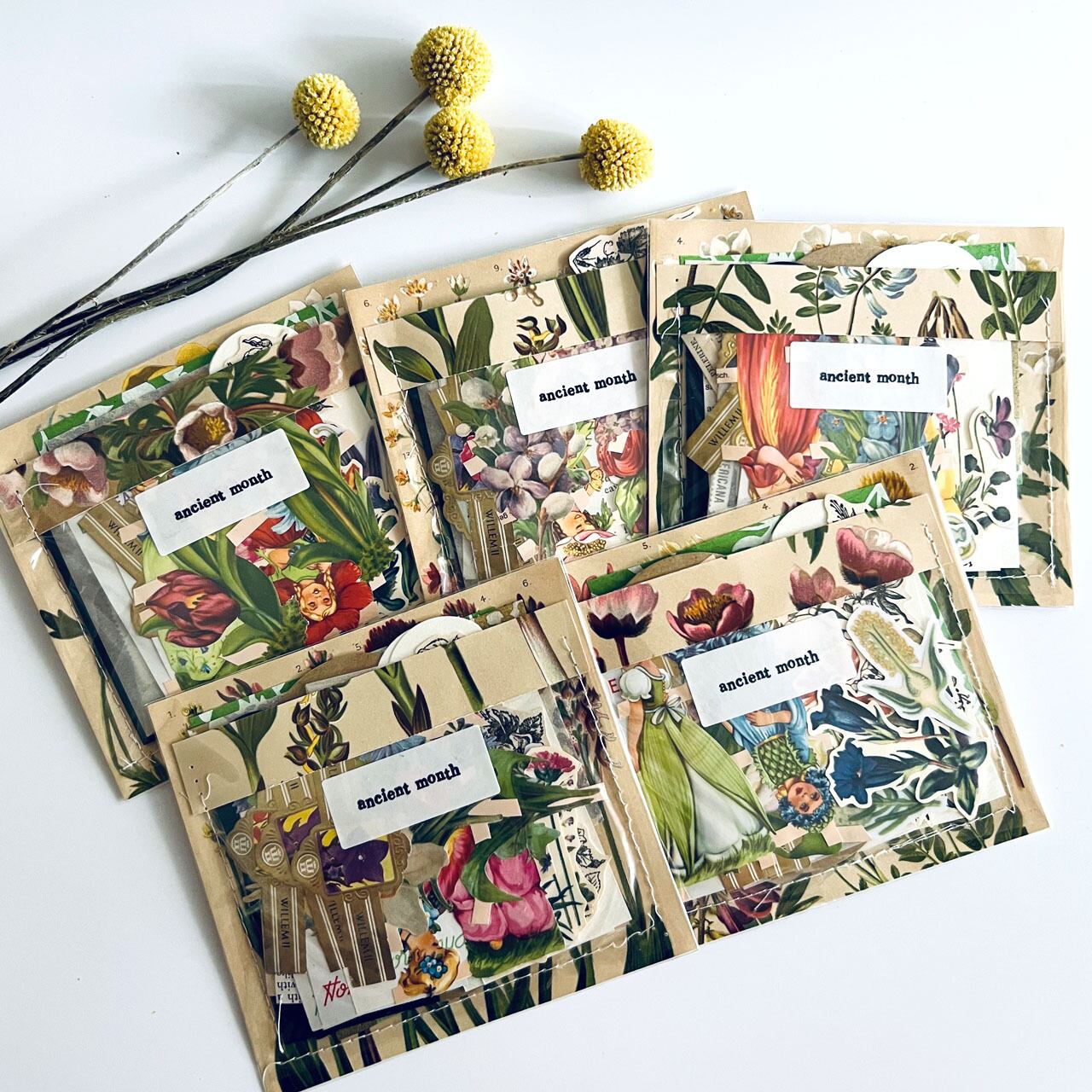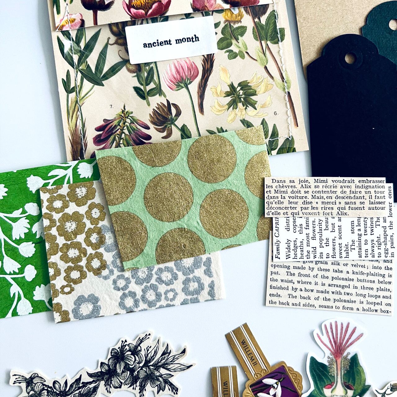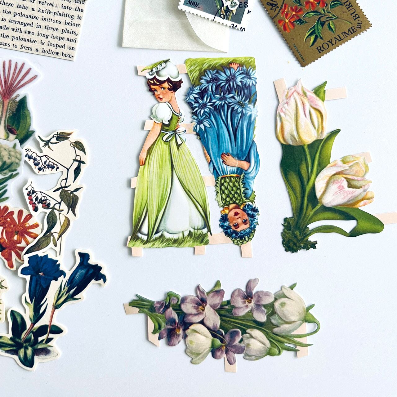 数枚のタグと色々なボタニカルなヴィンテージ切手、切り抜き、チケット、コロモスなどを詰めました。