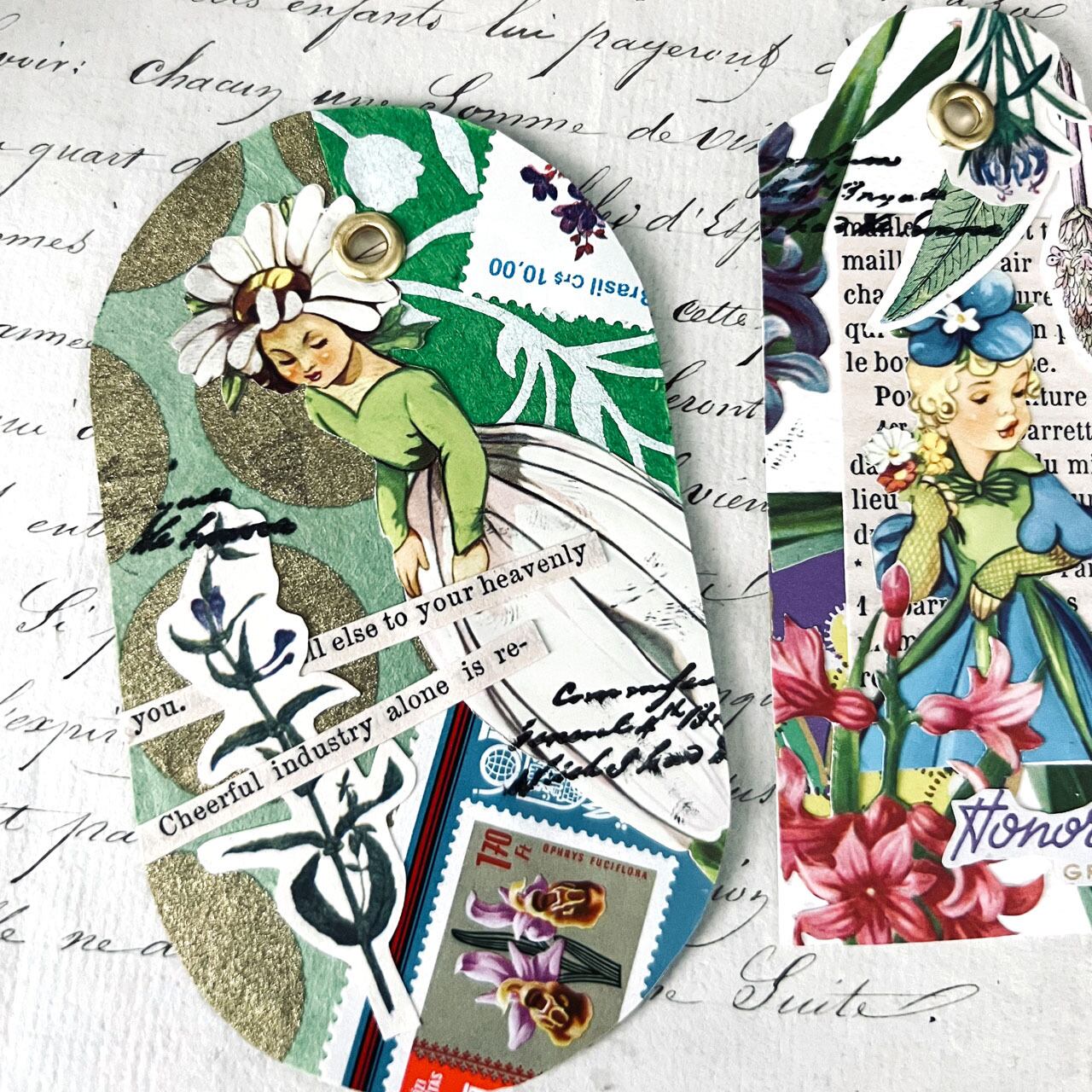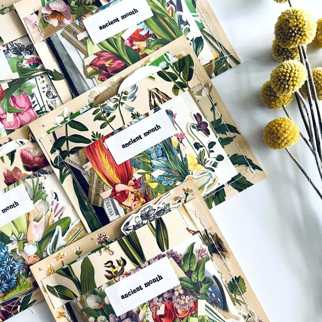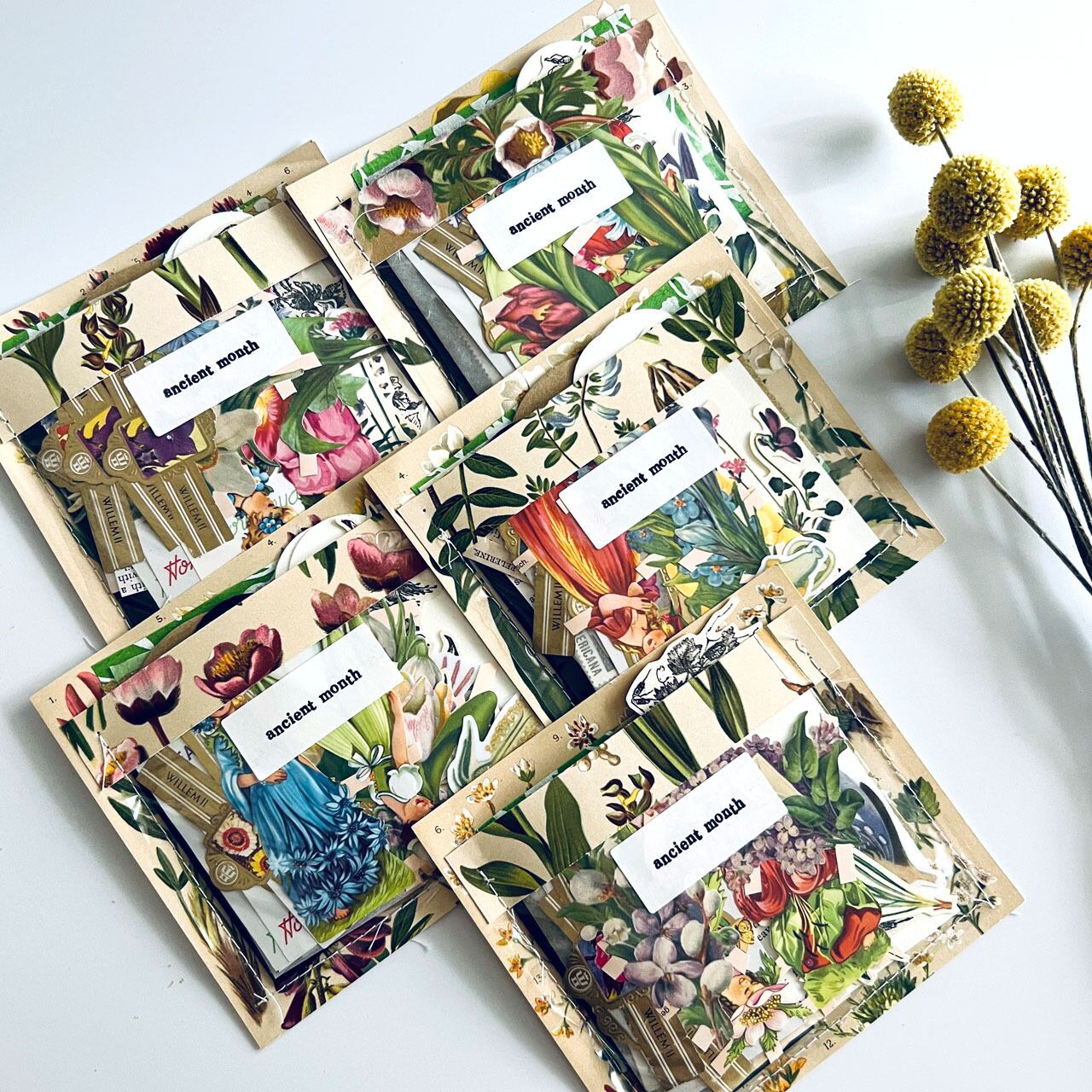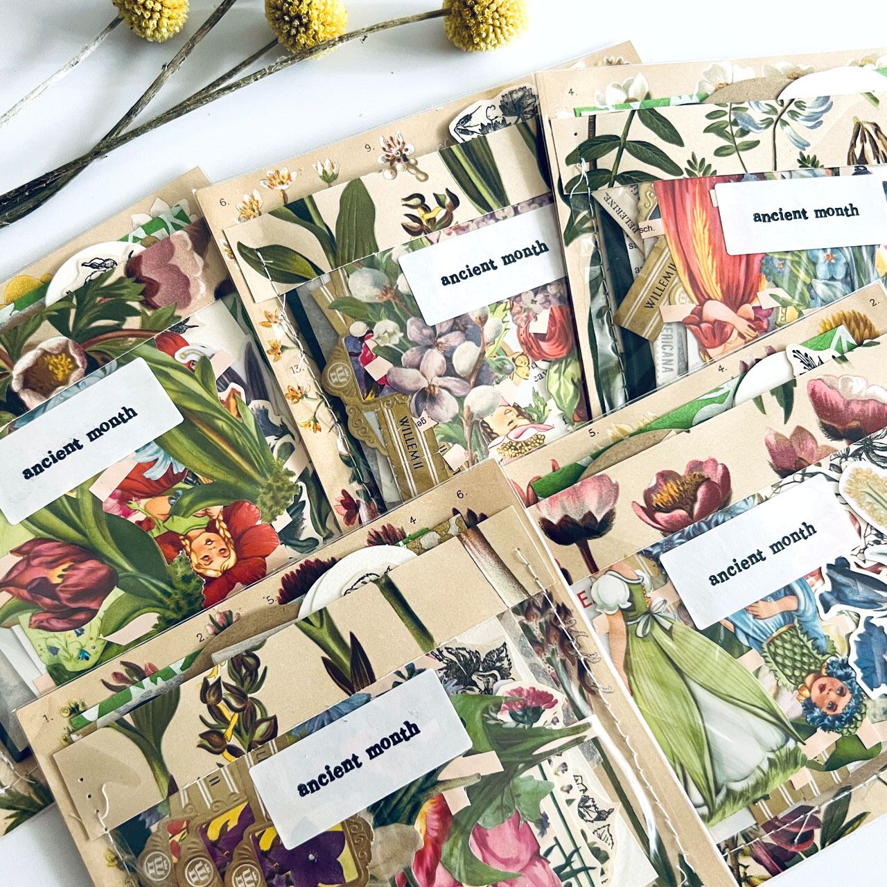 数枚のタグと色々なボタニカルなヴィンテージ切手、切り抜き、チケット、コロモスなどを詰めました。