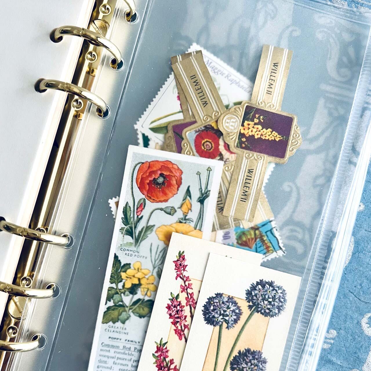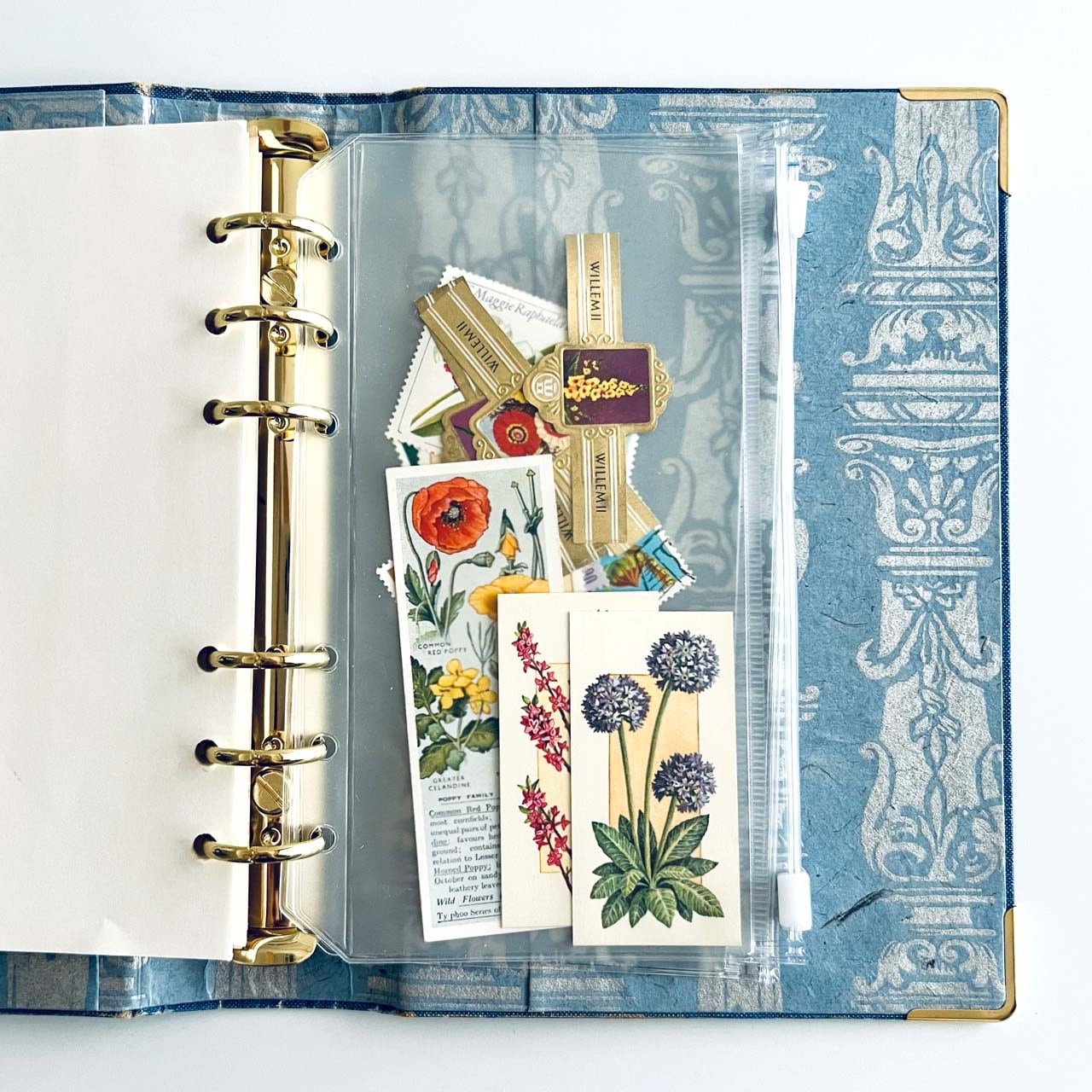 中身のアンティーク素材や紙ものやファイルポケットもついています。