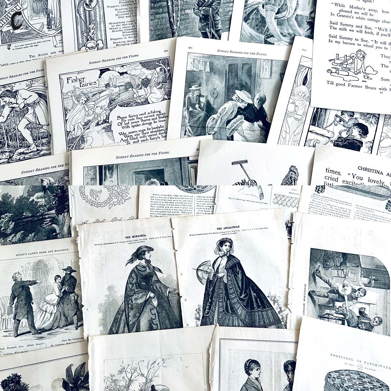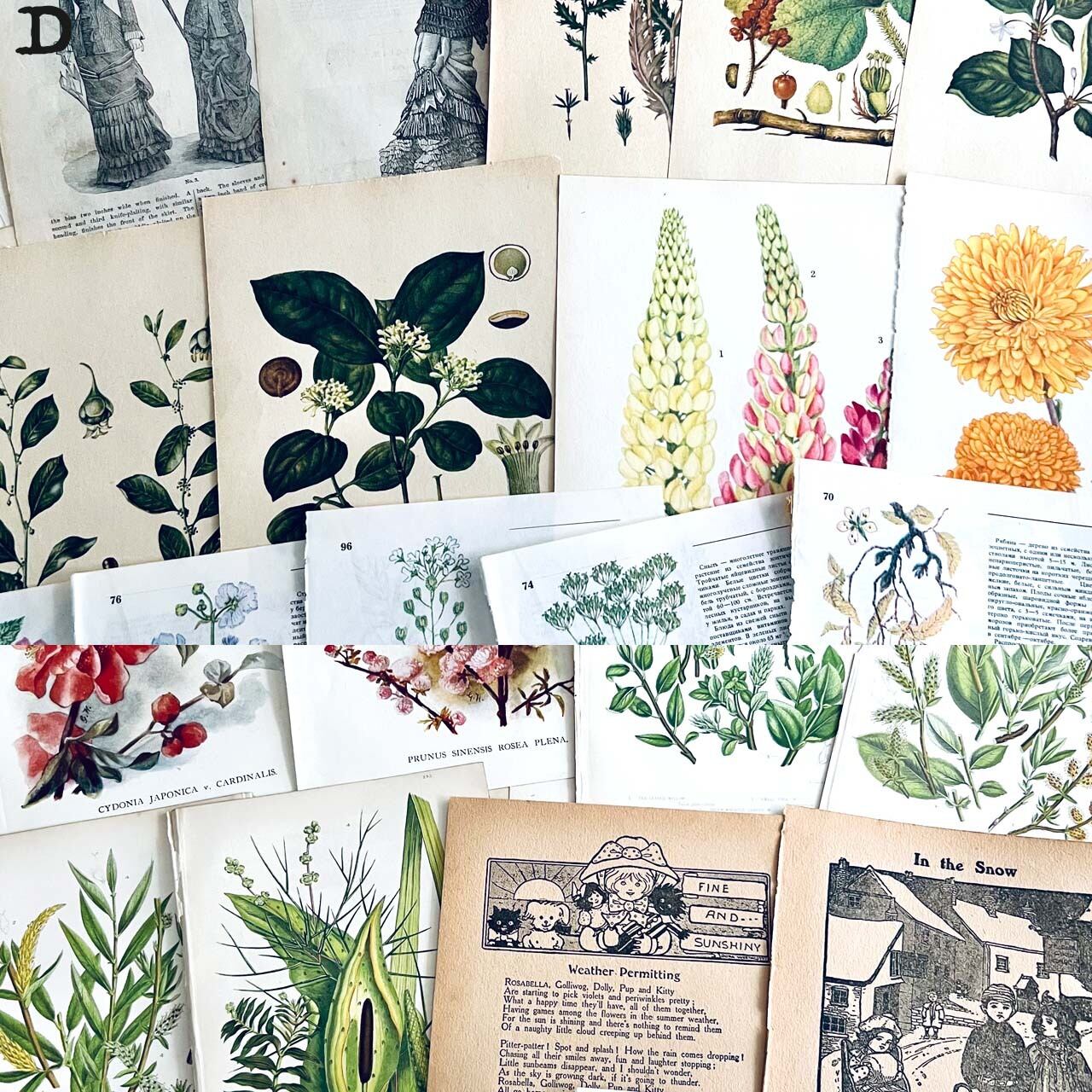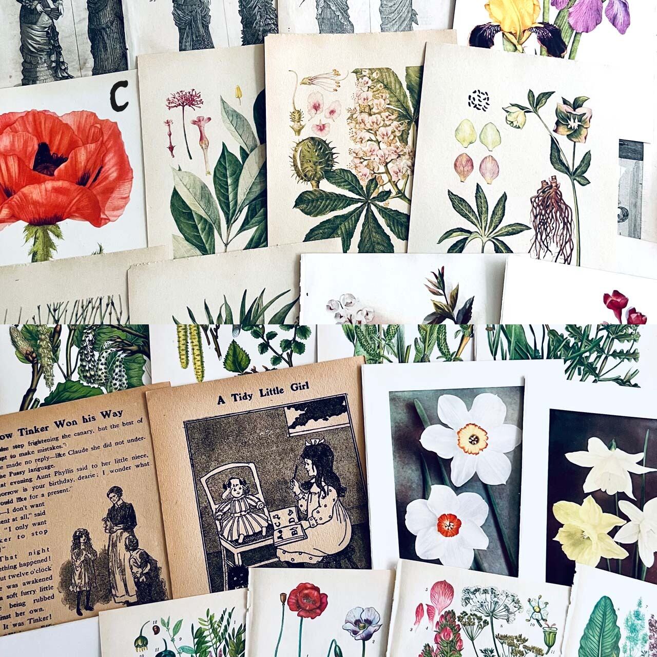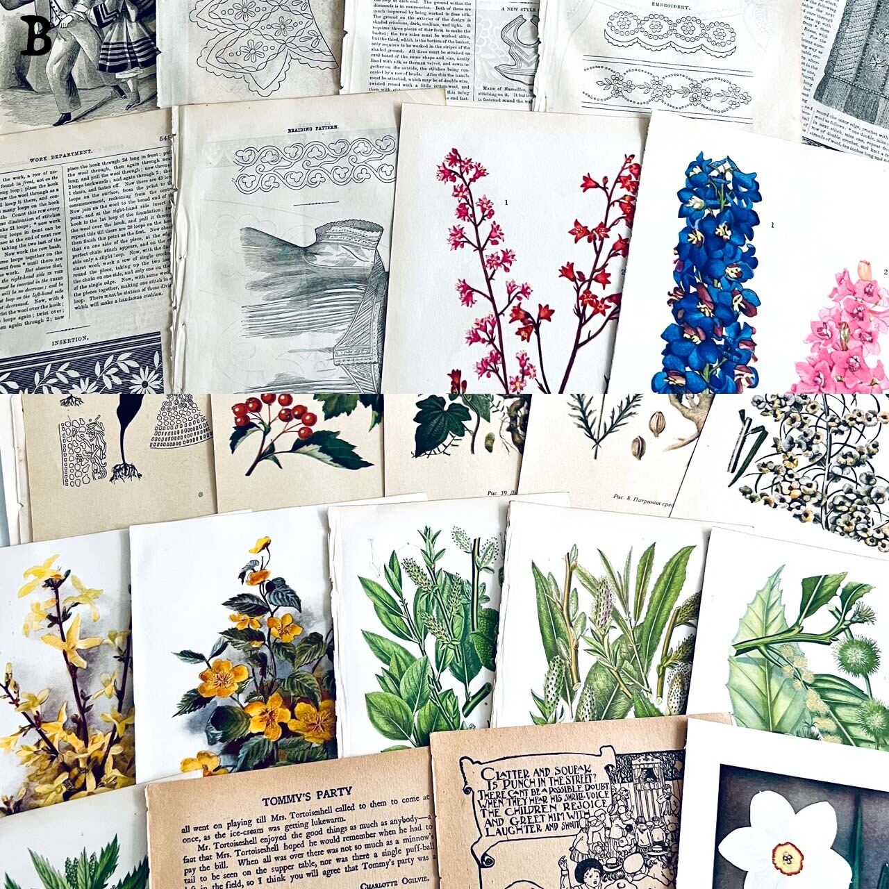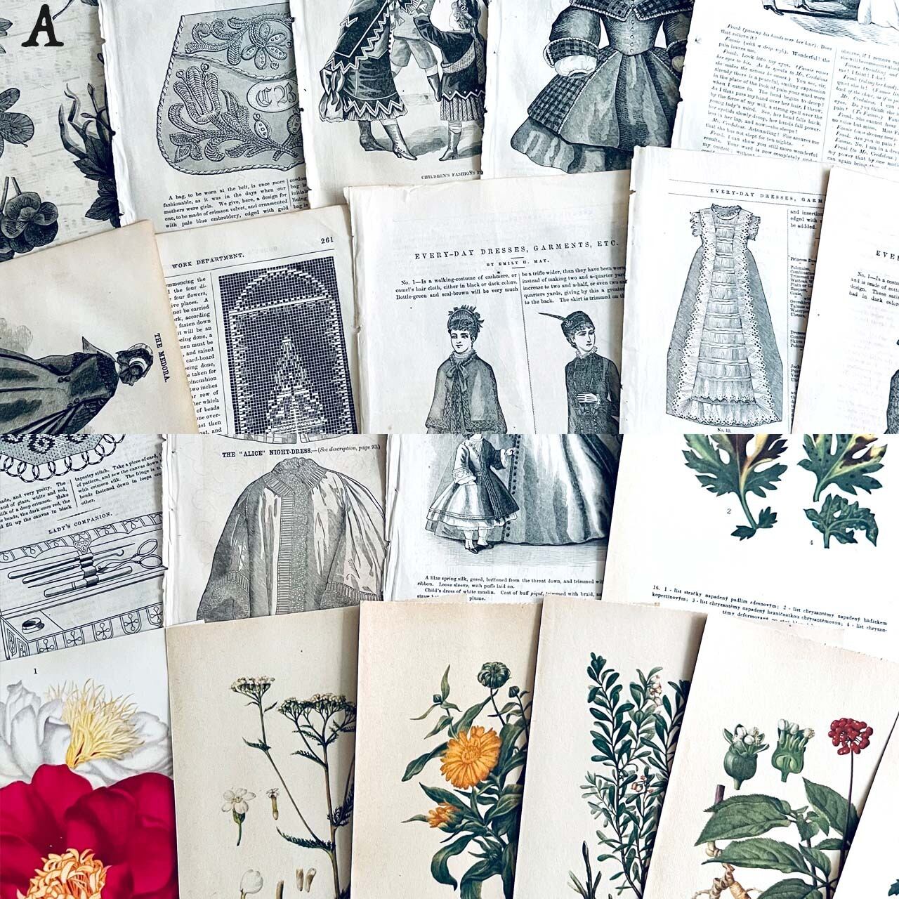 ヴィクトリアン時代のファッション誌や児童書の美しい大判挿絵、銅版画、アンティーク植物図鑑の貴重なカラープレートなど一枚で数千円する素材も入っております。