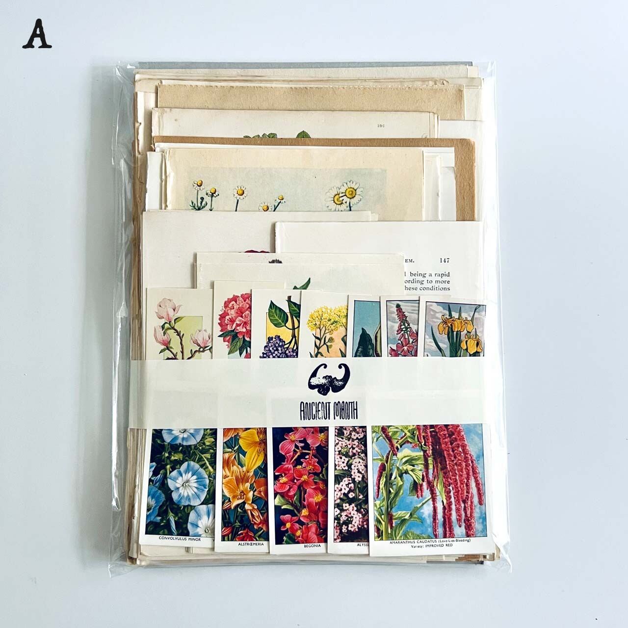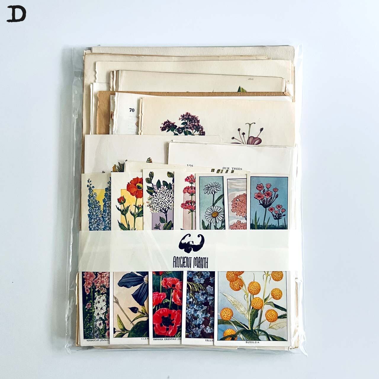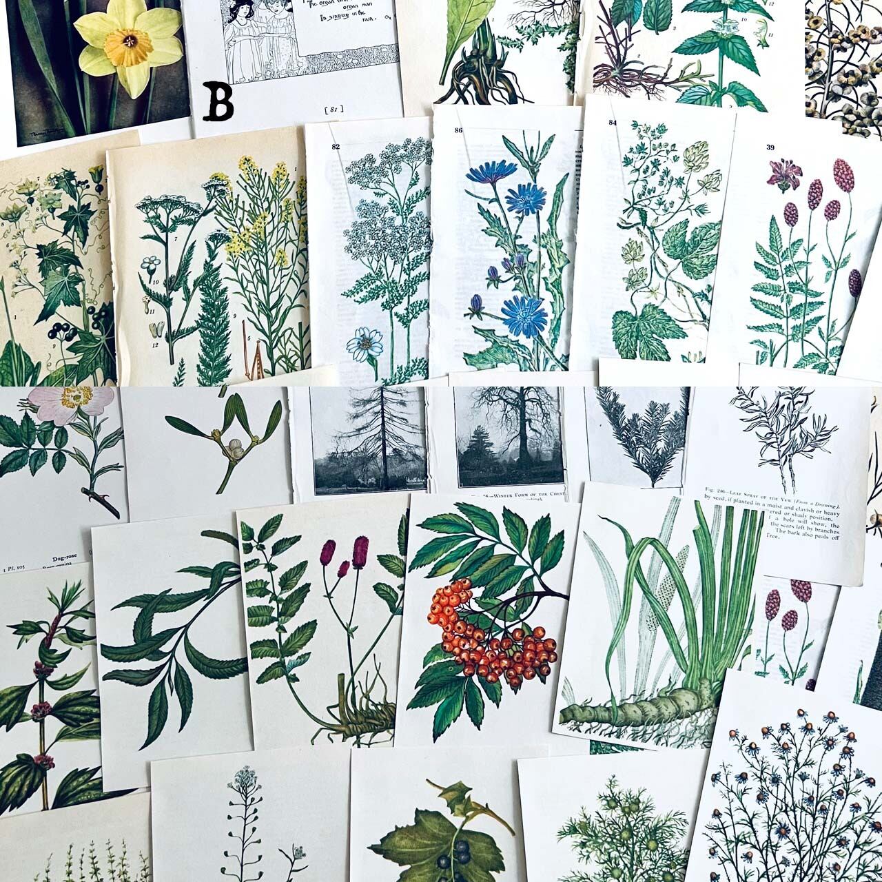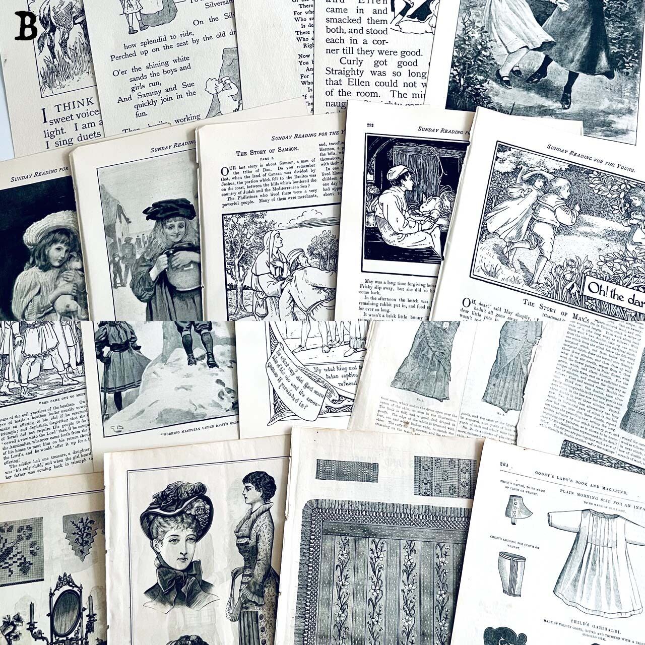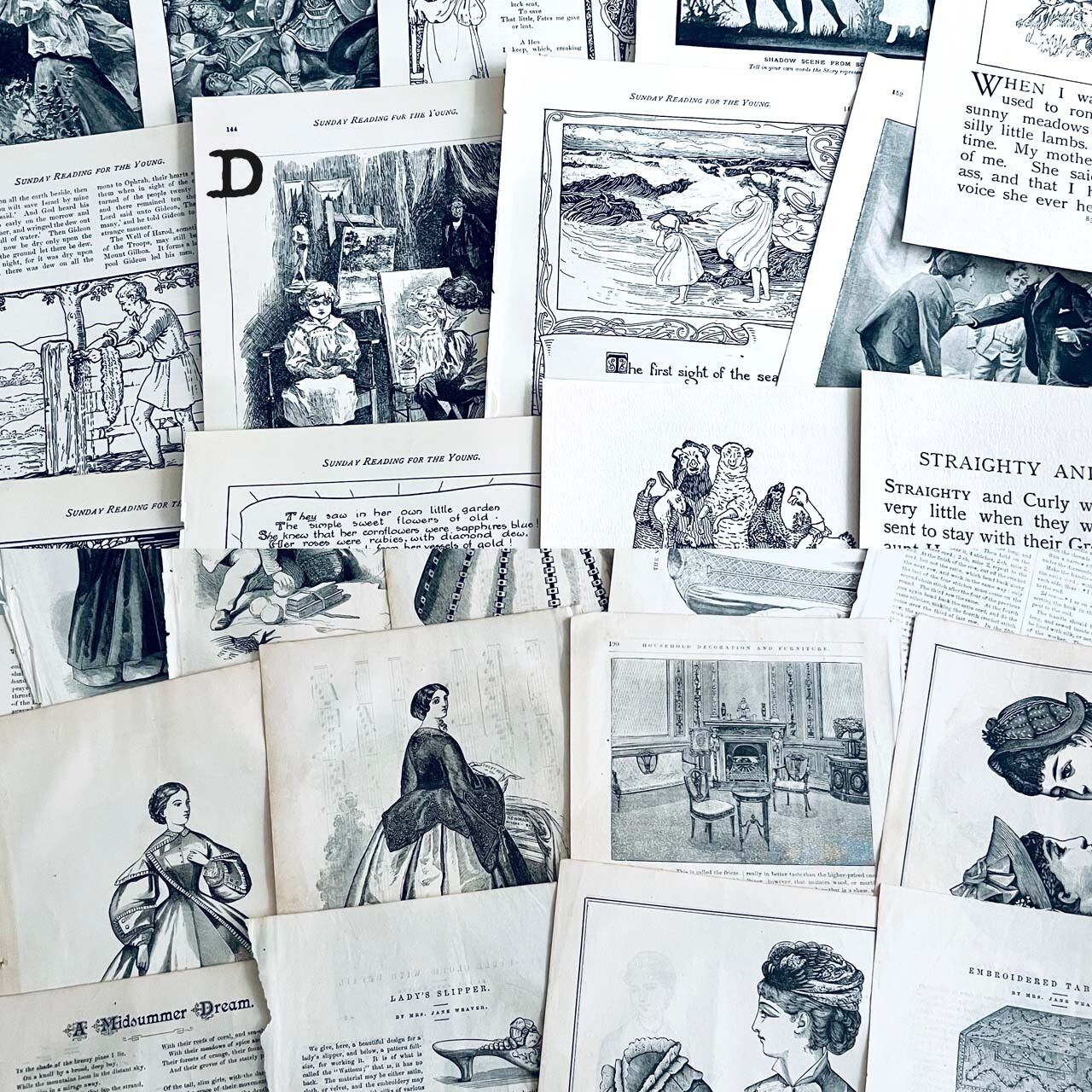 ヴィクトリアン時代のファッション誌や児童書の美しい大判挿絵、銅版画、アンティーク植物図鑑の貴重なカラープレートなど一枚で数千円する素材も入っております。