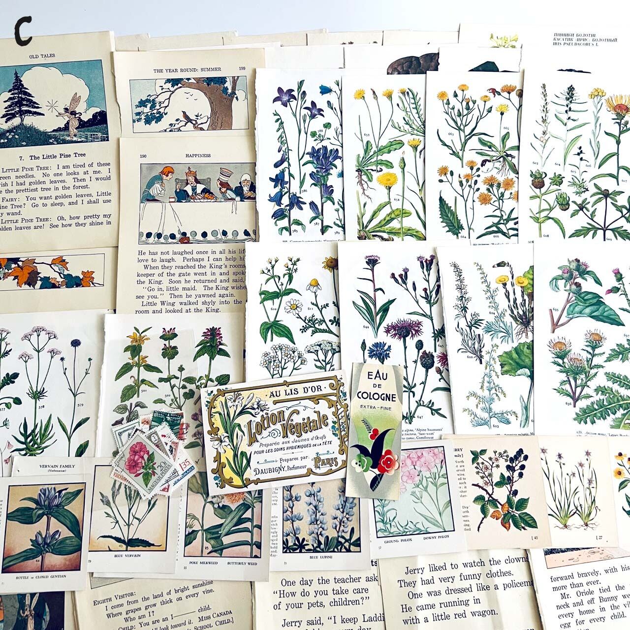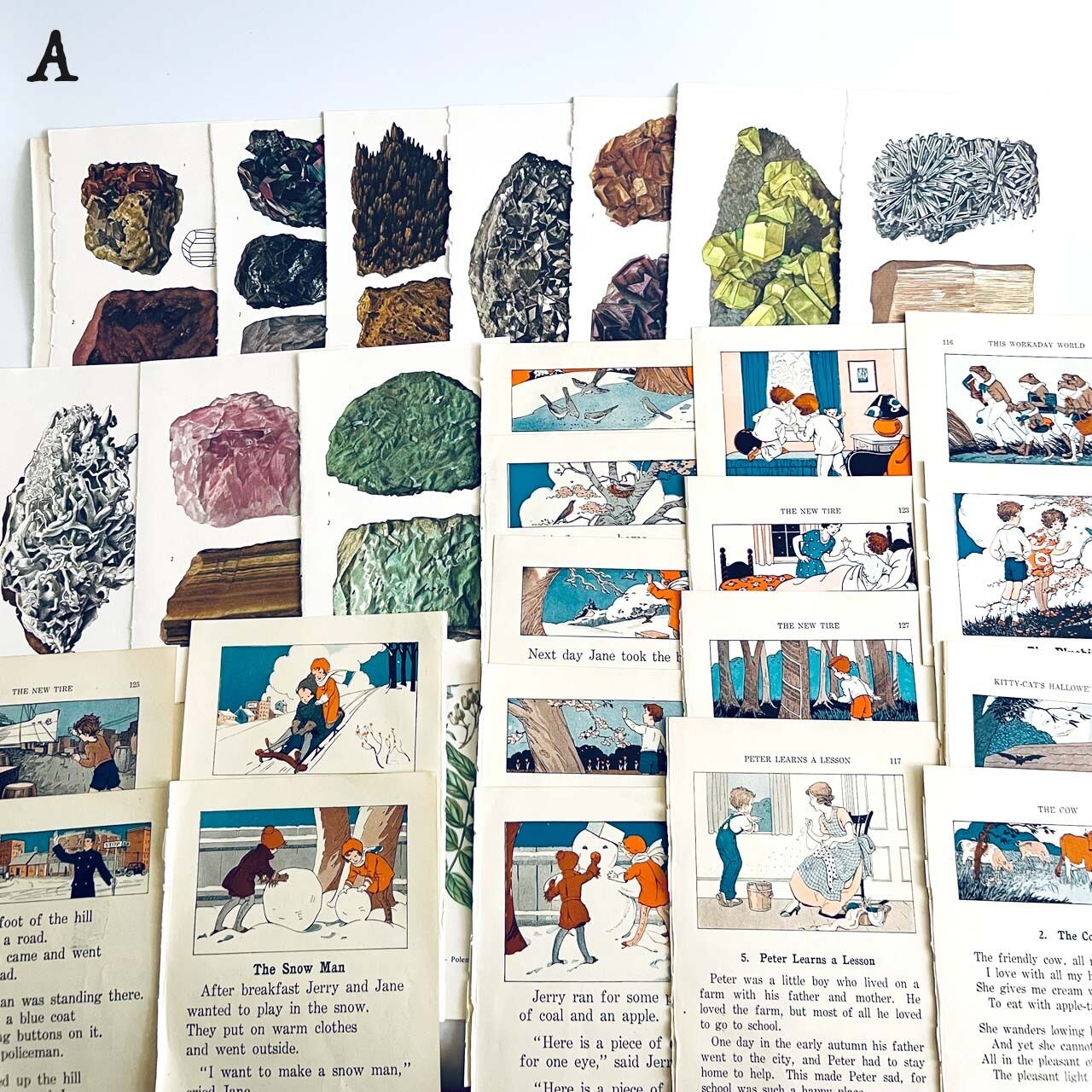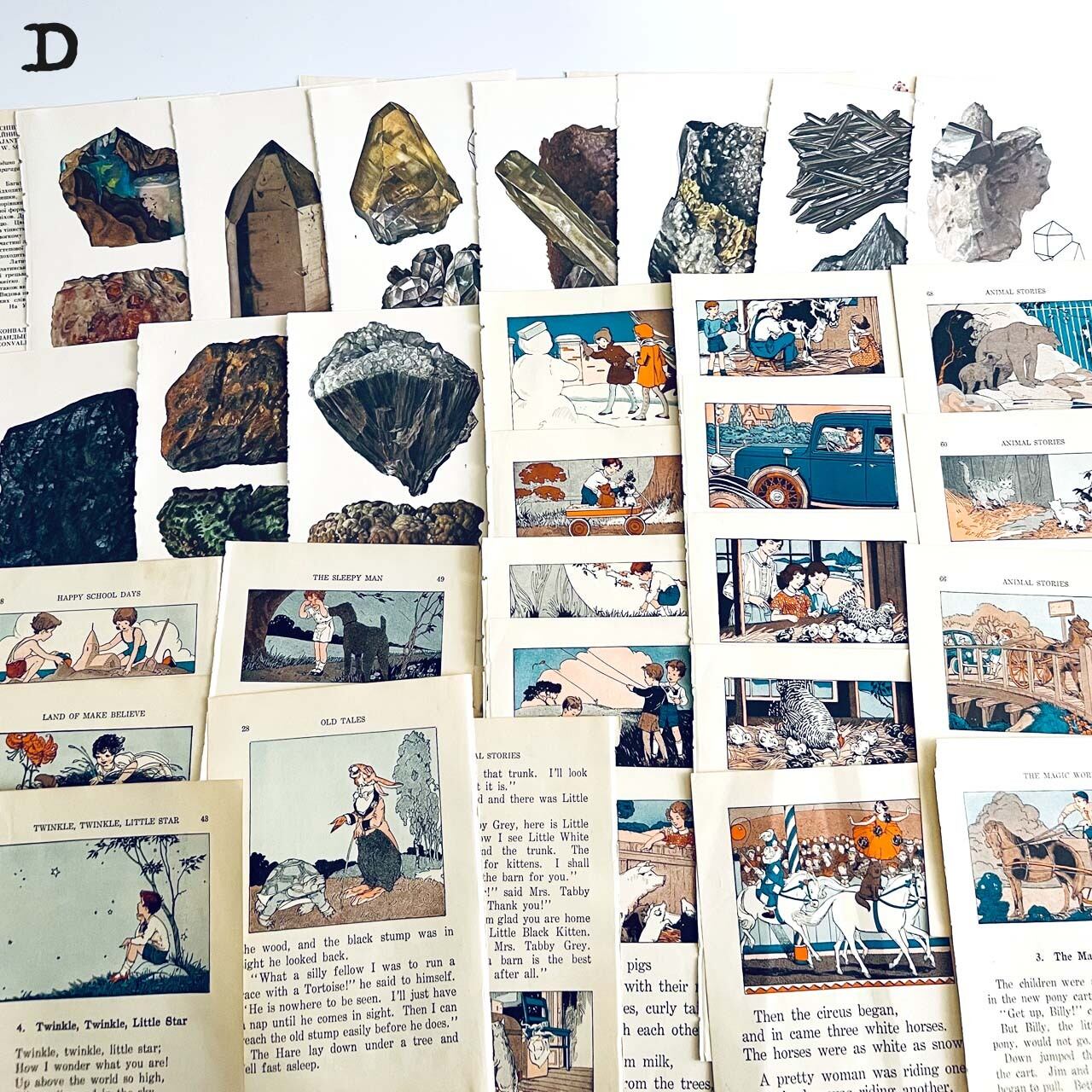アンティークヴィンテージ植物図鑑や鉱石図鑑、児童書などから集めました。