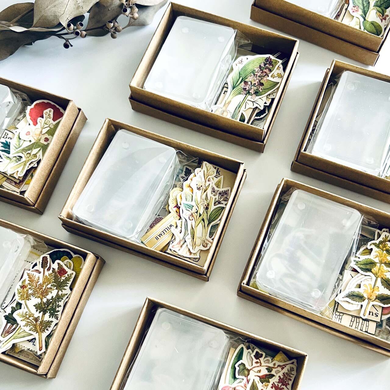 ミニミニサイズのアクリルフレームと色々なスッテカー、切手などを詰めました。