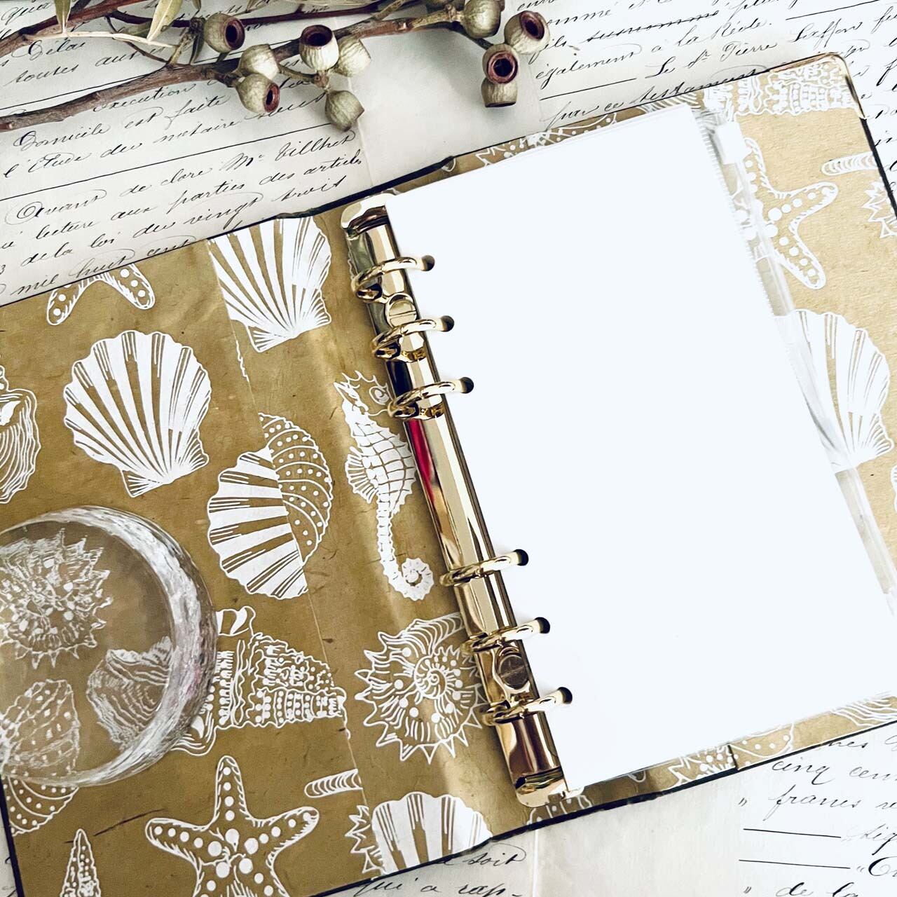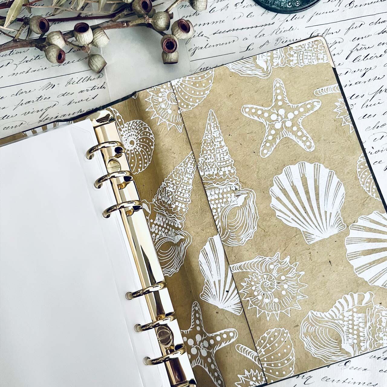 裏地は表紙に合わせた遊び心ある貝殻の装飾紙を使用しております。