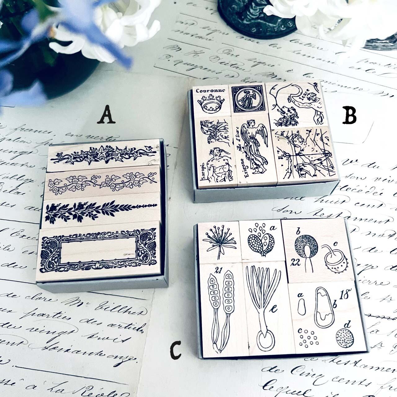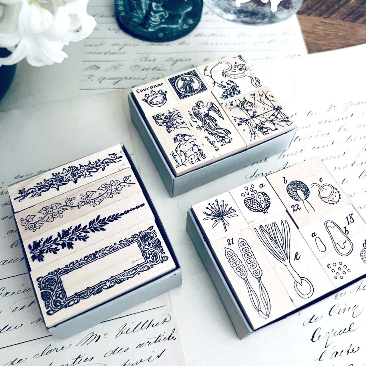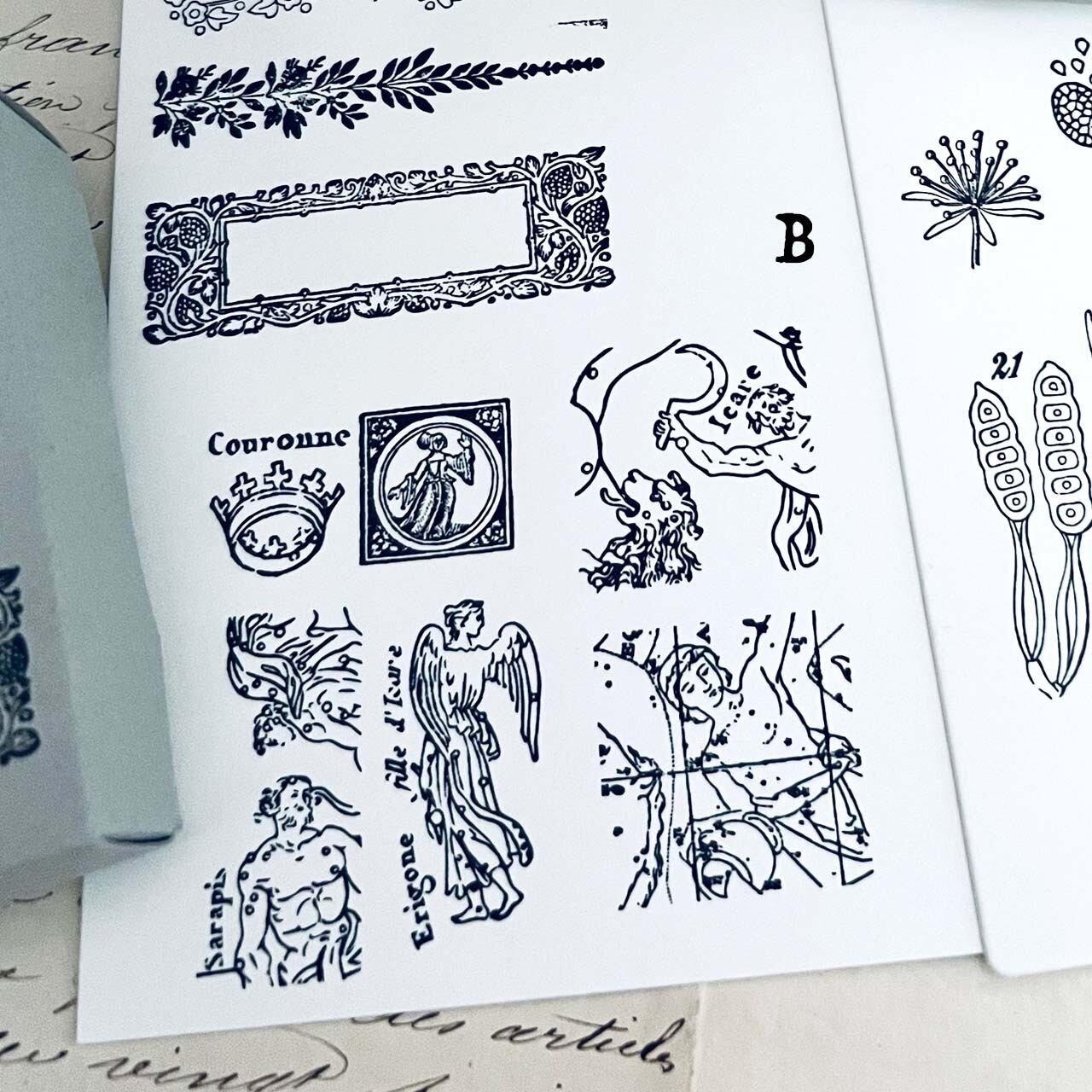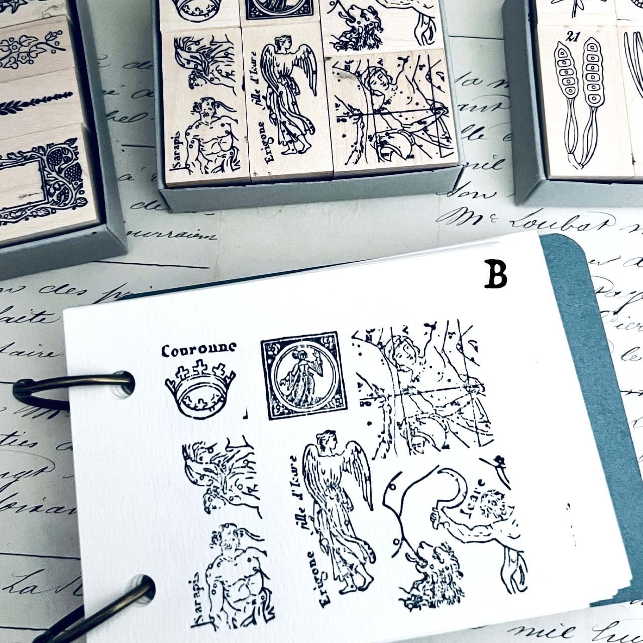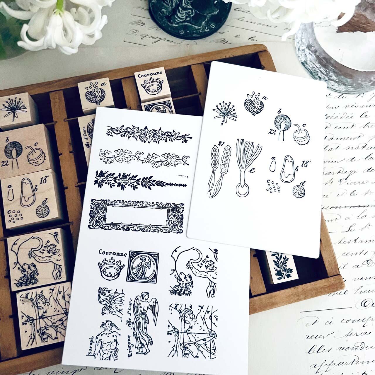 18世紀から19世紀にかけての飾り模様、植物解剖図、星座などをモチーフに制作した当店オリジナルのスタンプです。
