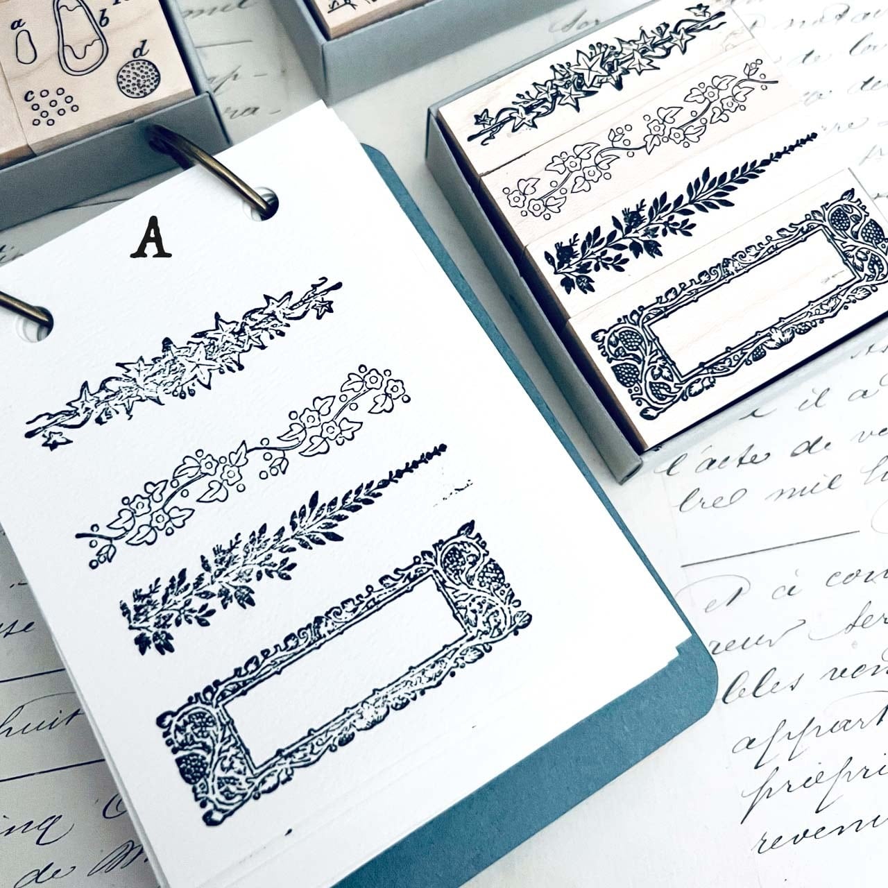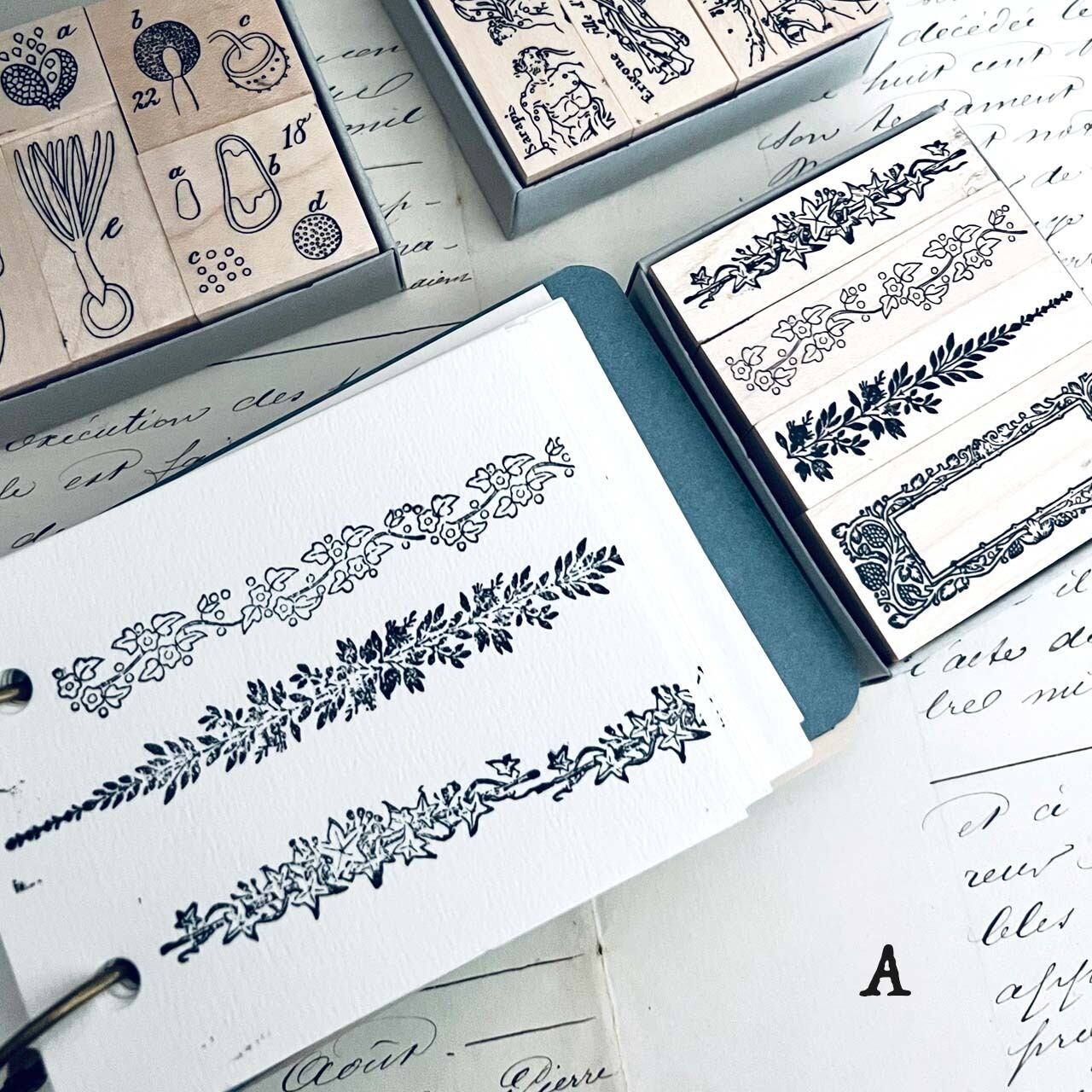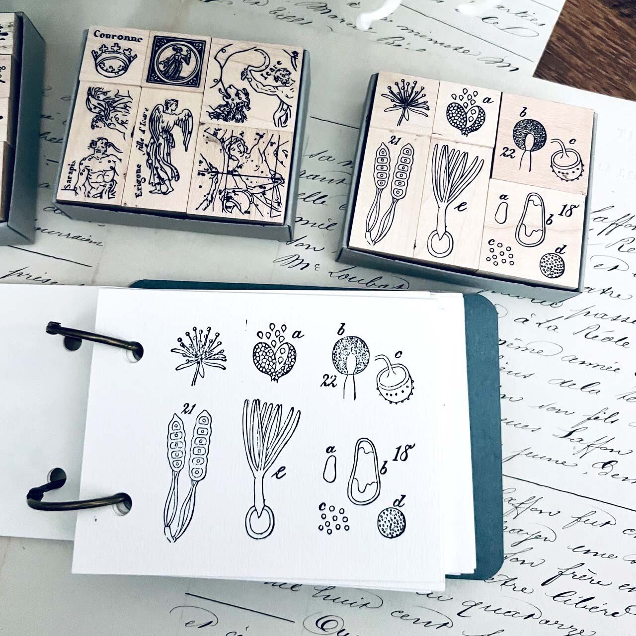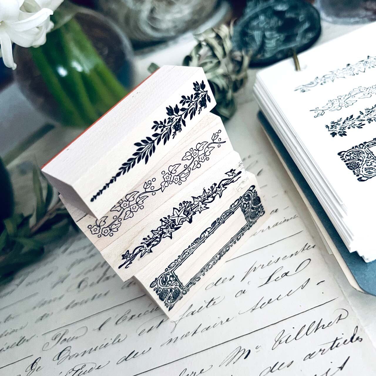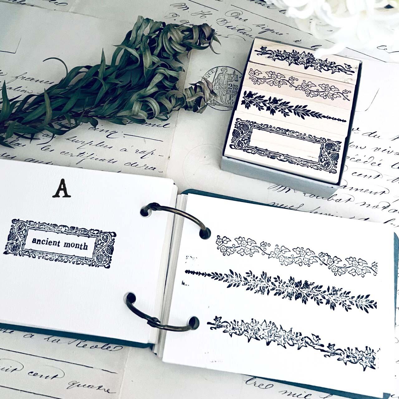 18世紀から19世紀にかけての飾り模様、植物解剖図、星座などをモチーフに制作した当店オリジナルのスタンプです。