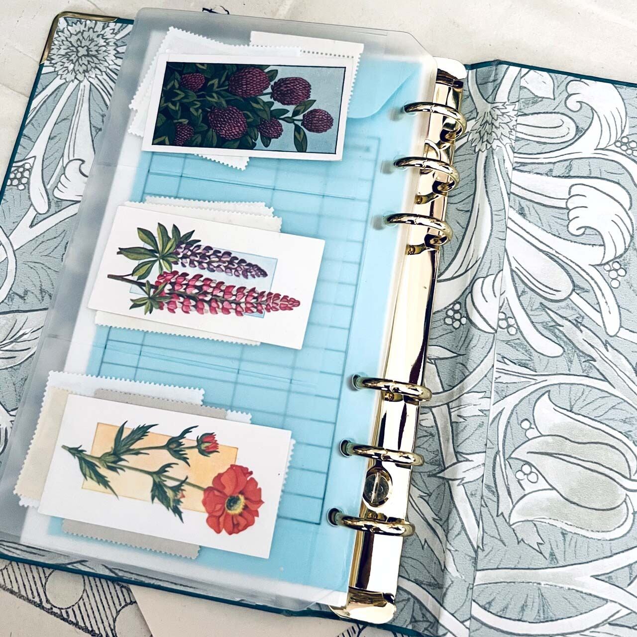 裏地は表紙に合わせたブルーグレーのウィリアムモリスの装飾紙を使用しております。