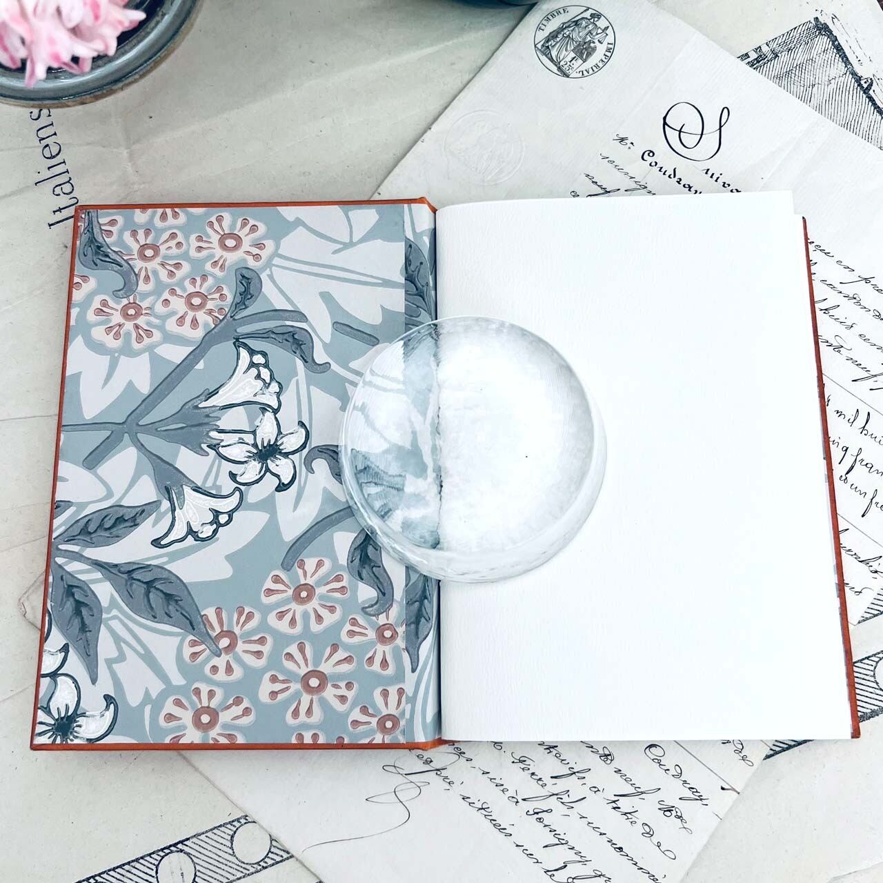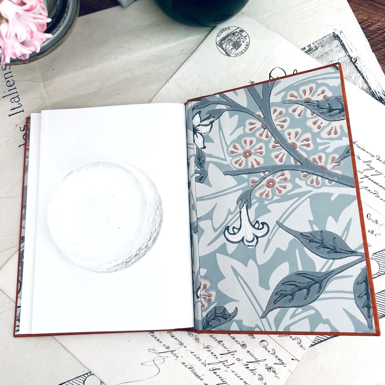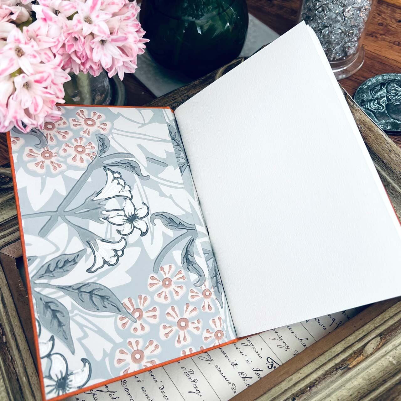 裏表紙も表紙の色に合わせてすこそオレンジの入ったウィリアムモリスの装飾紙を使用しております。