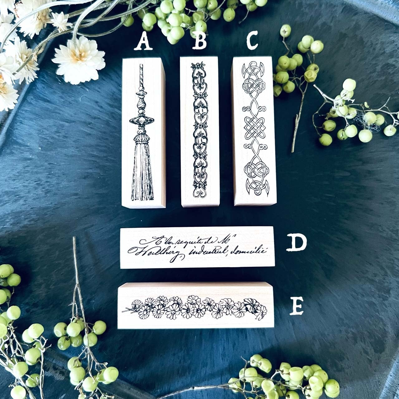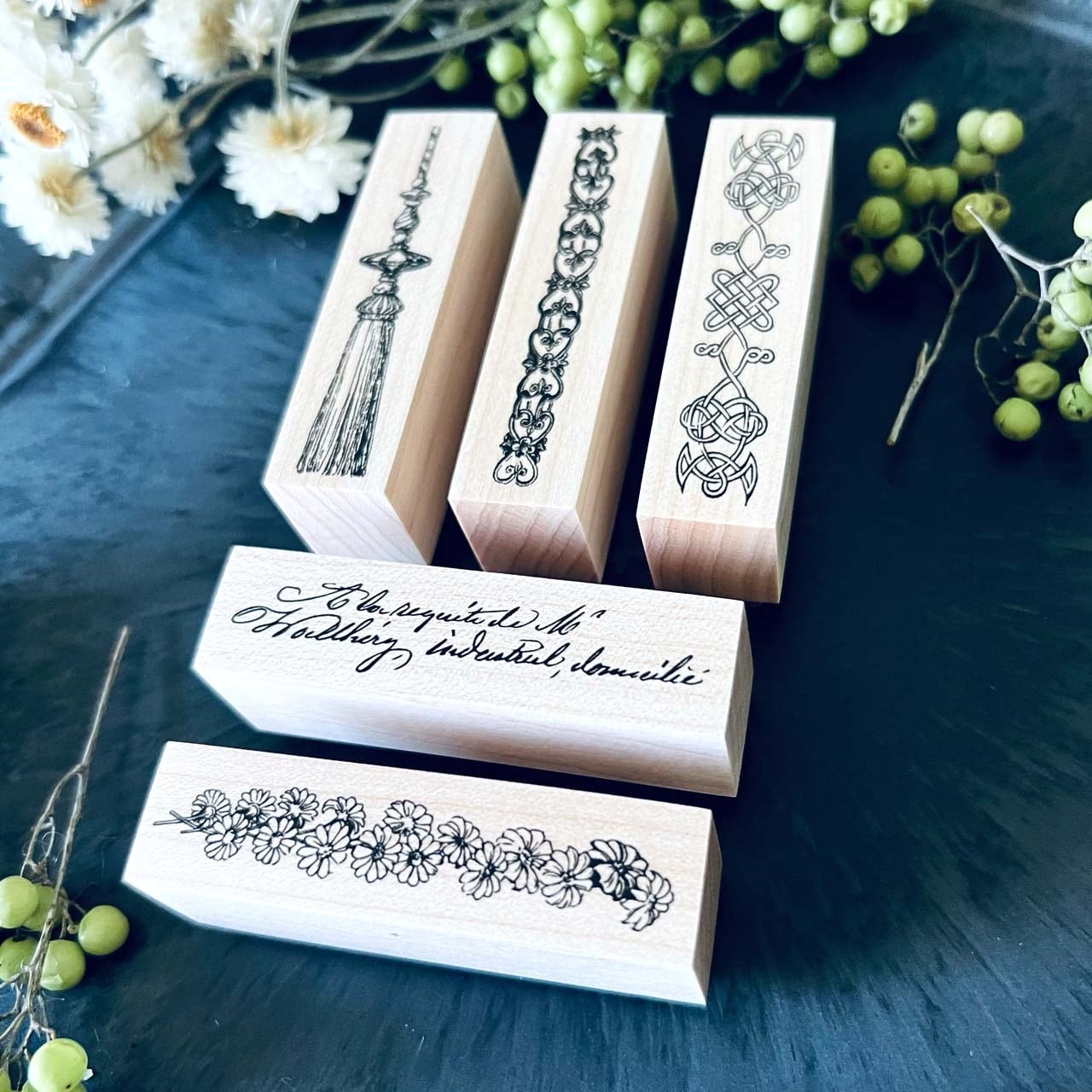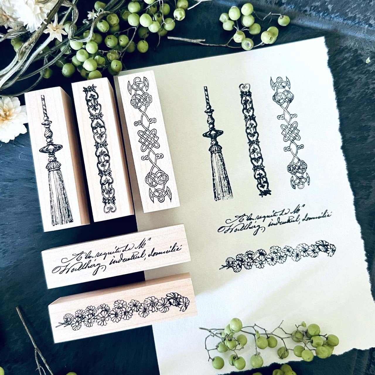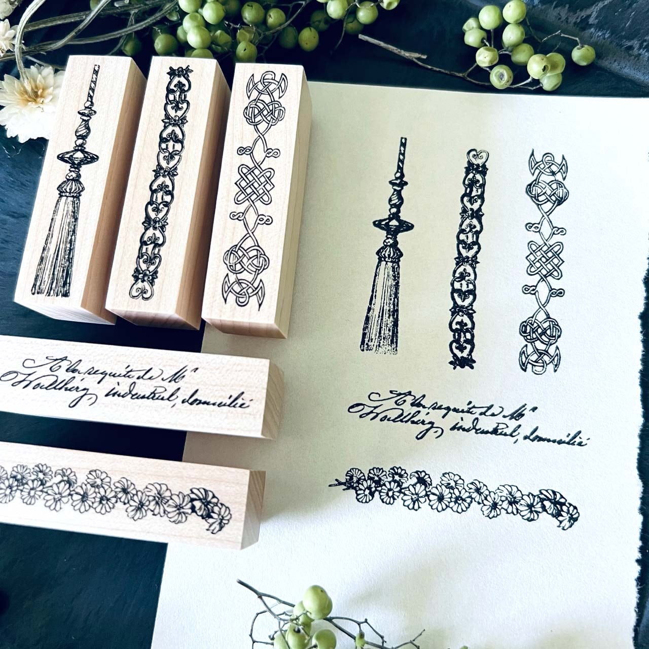 18世紀から19世紀にかけての飾り模様、手記、小説、公文書などから制作した当店オリジナルのスタンプです。