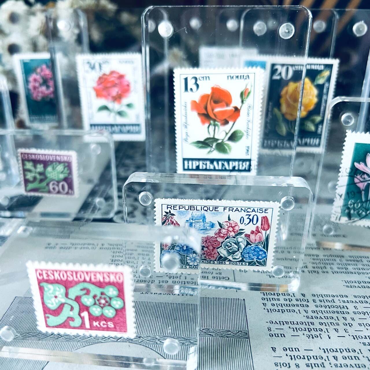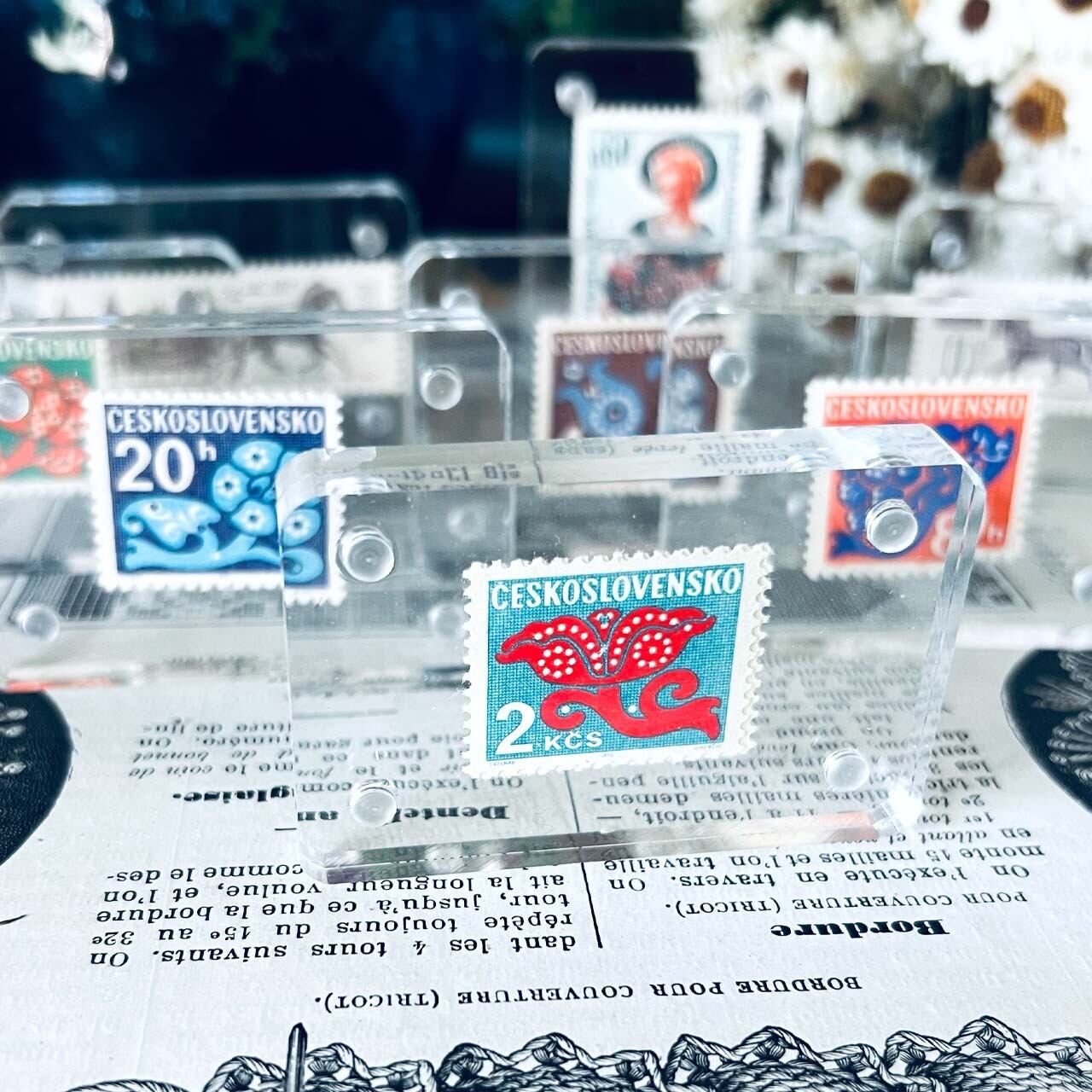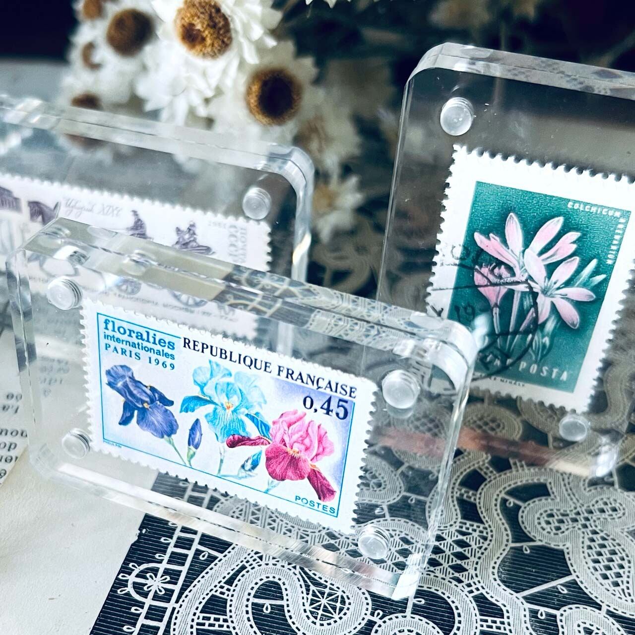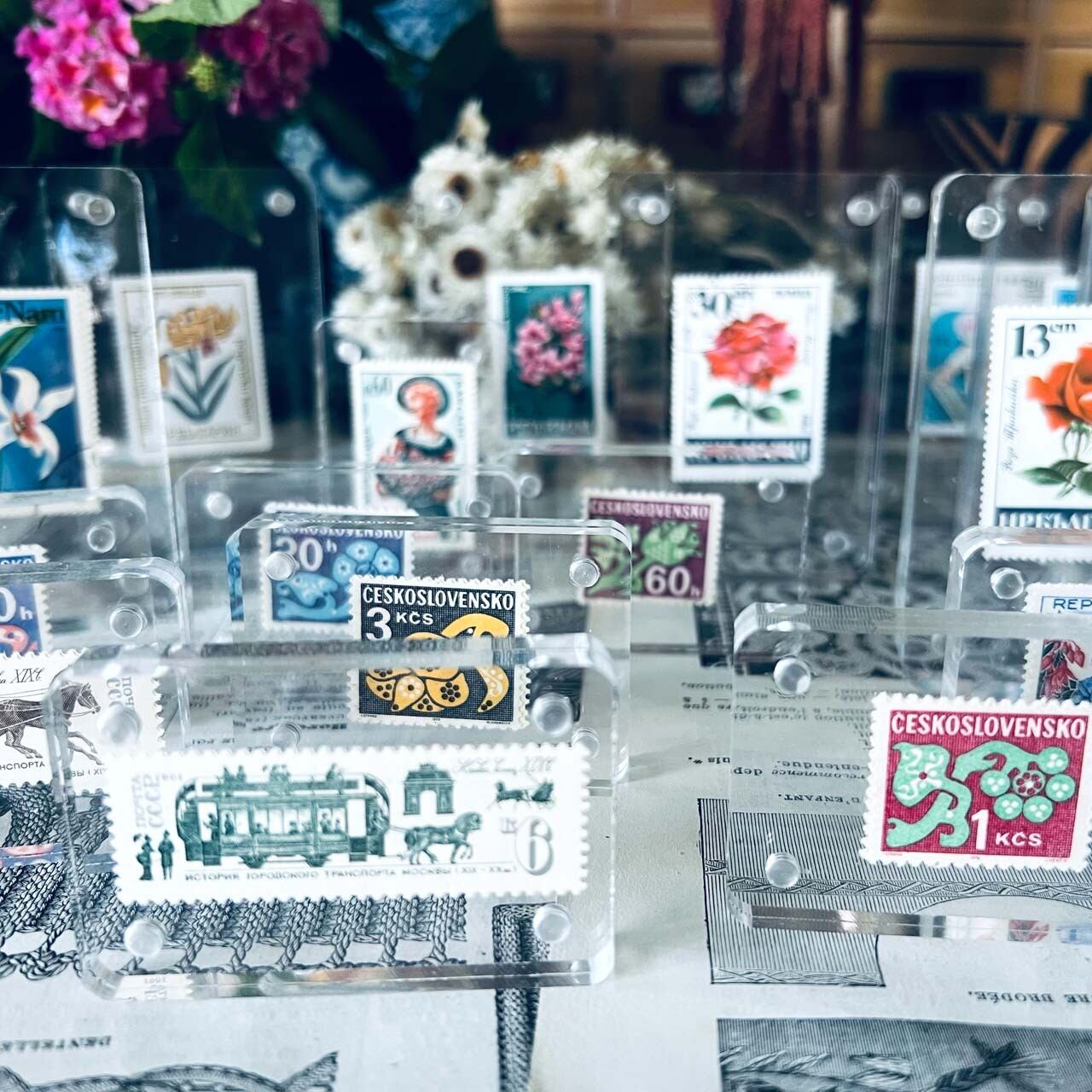 美しいヴィンテージ海外切手をアクリルスタンドに閉じ込めました。