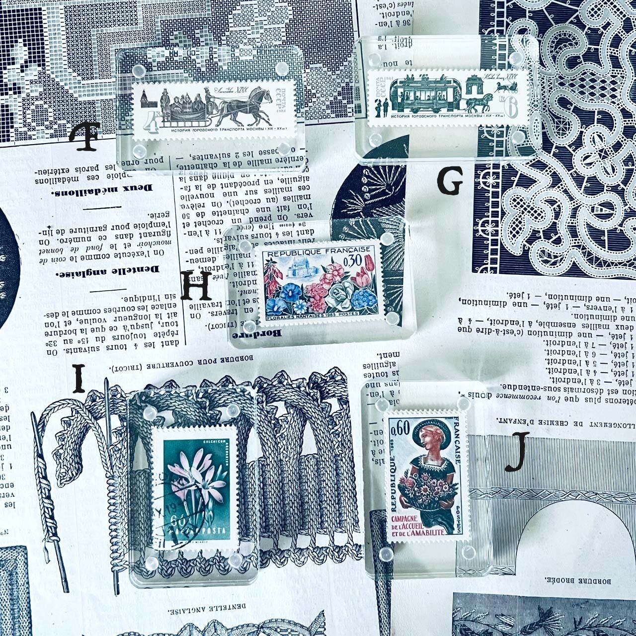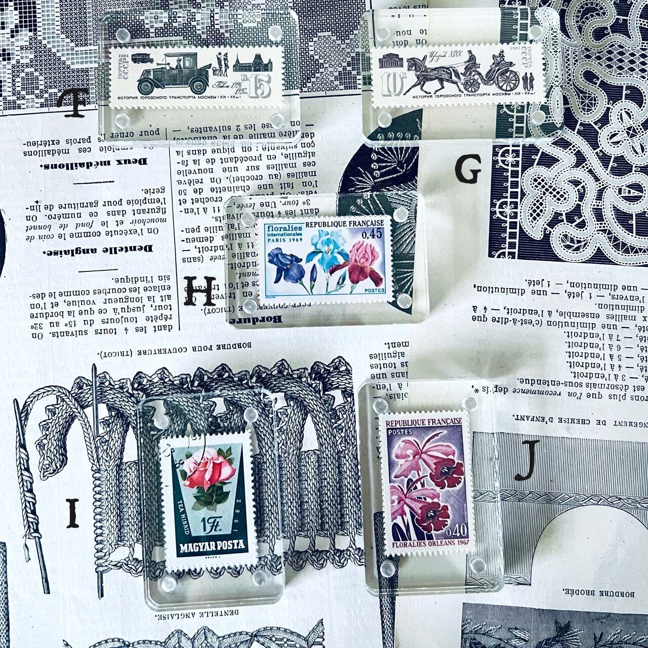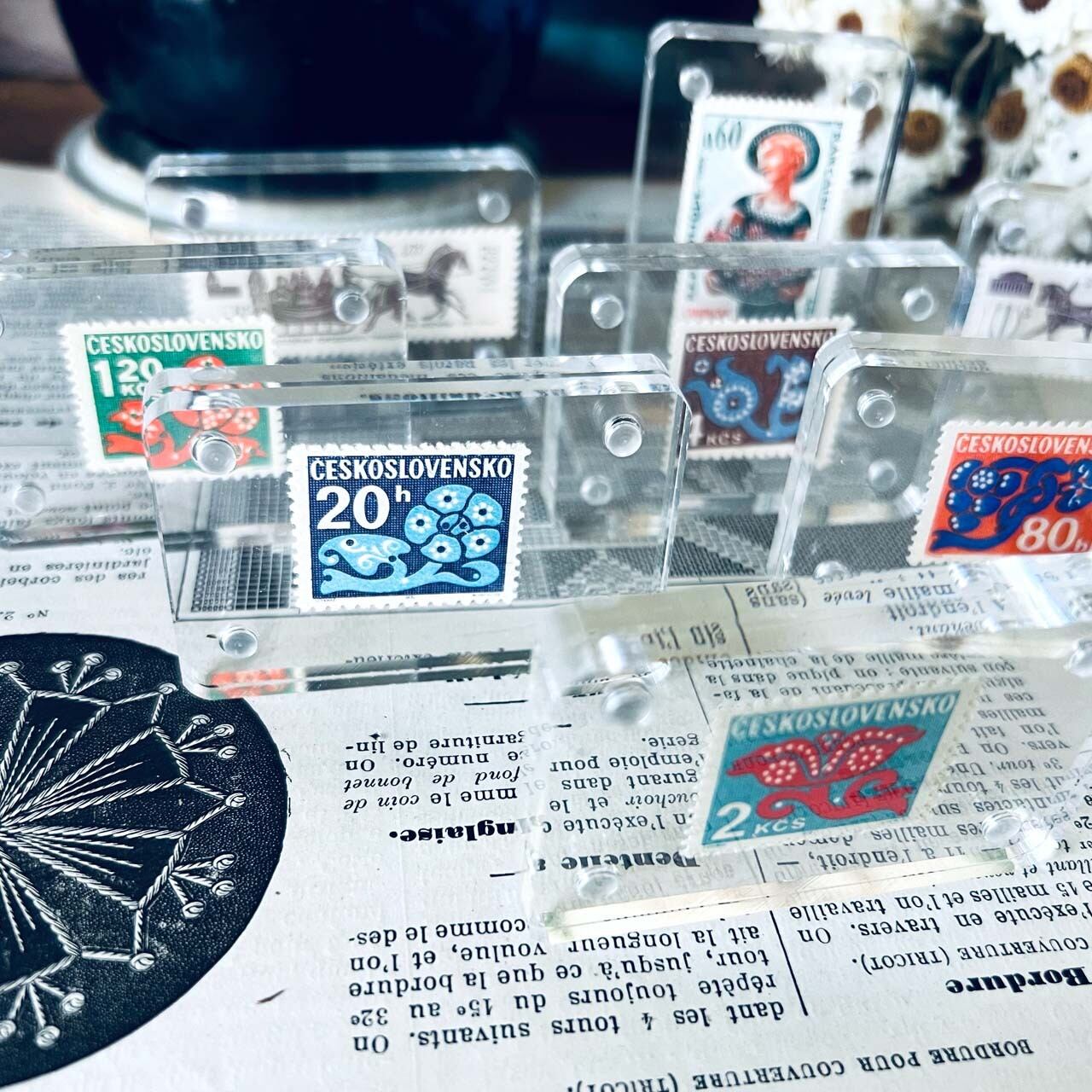 美しいヴィンテージ海外切手をアクリルスタンドに閉じ込めました。