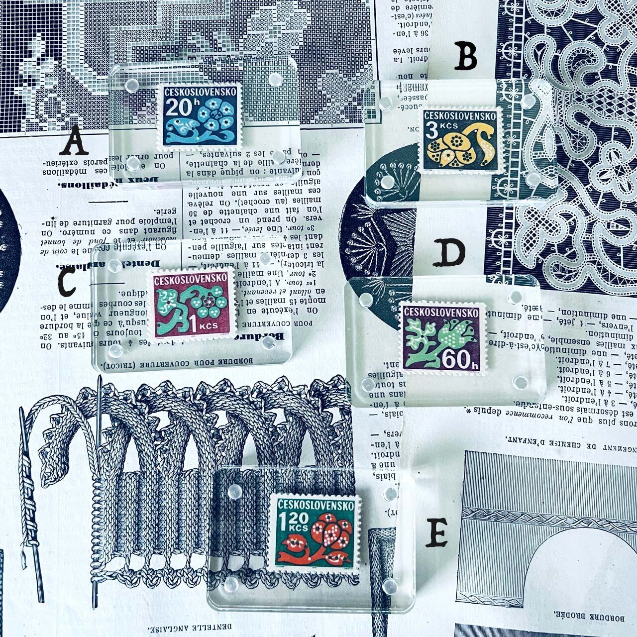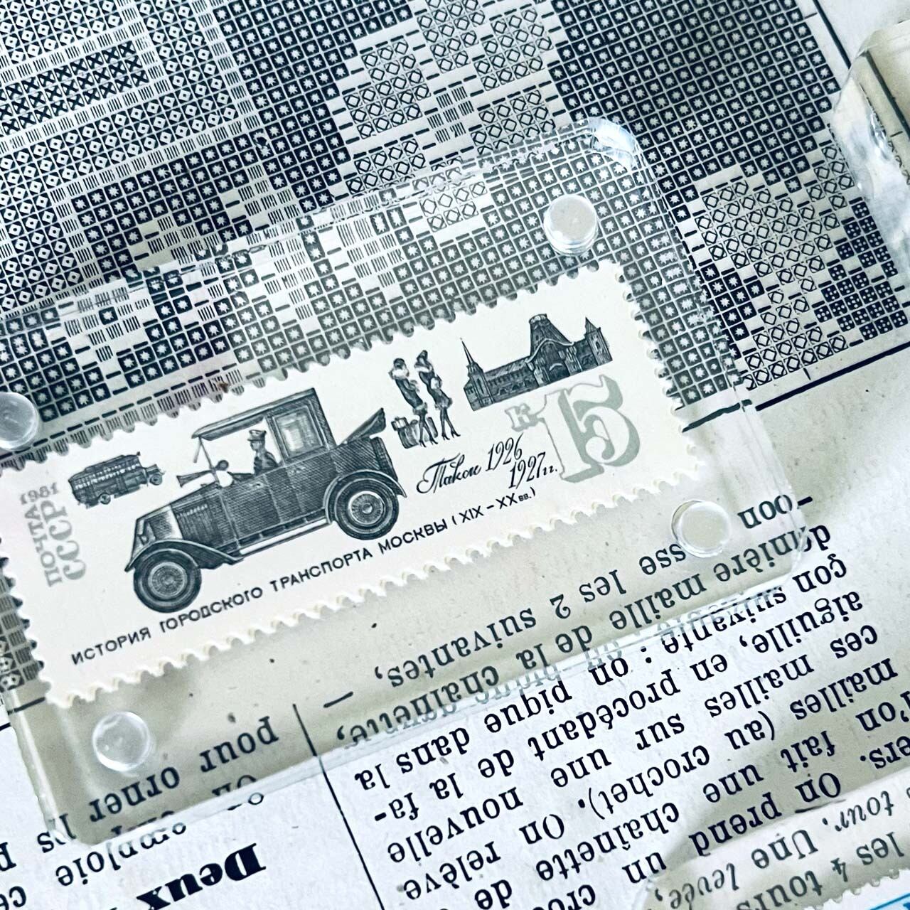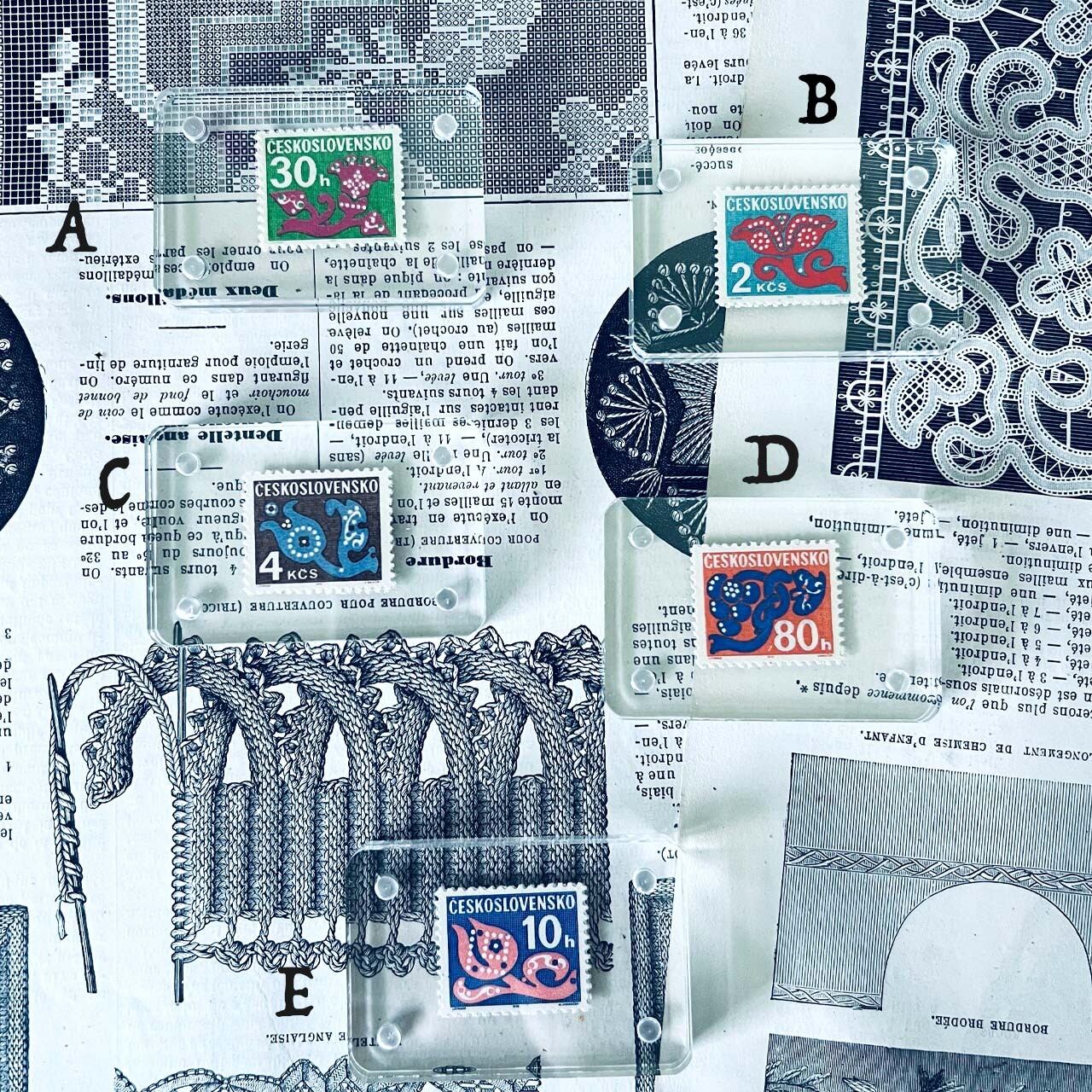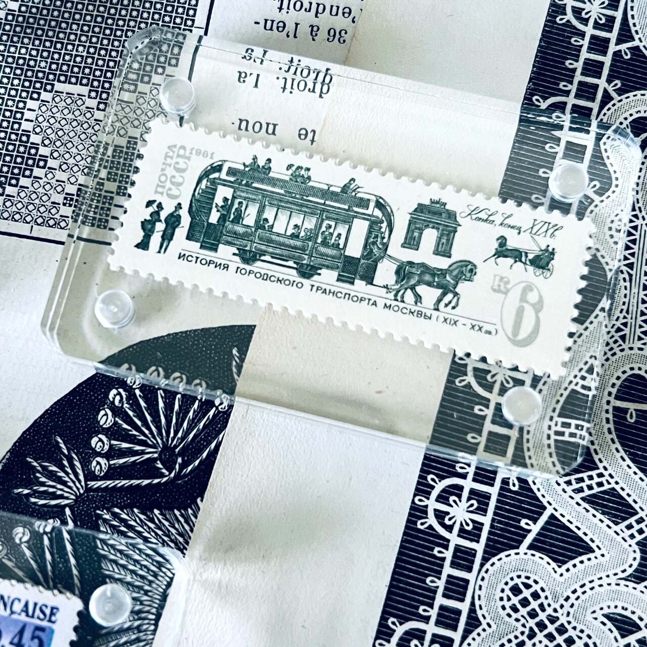 美しいヴィンテージ海外切手をアクリルスタンドに閉じ込めました。